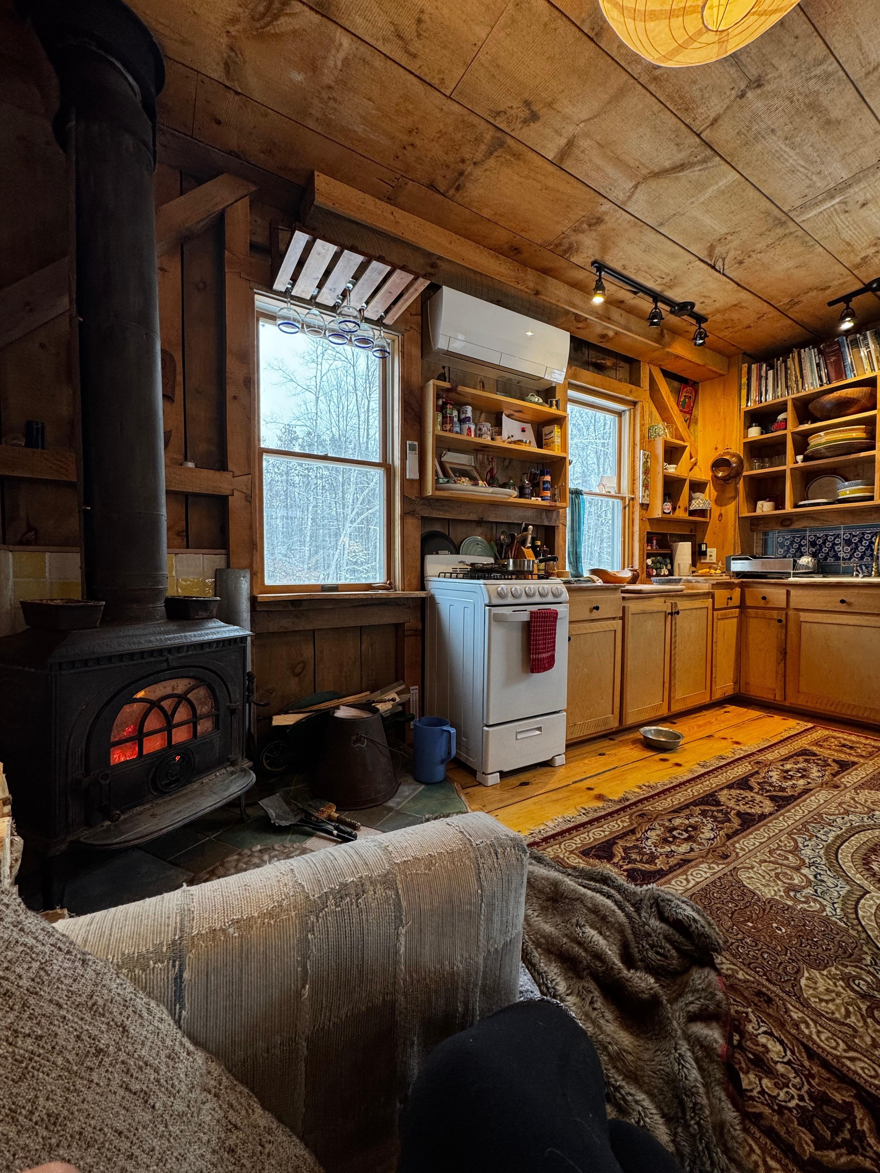 This is the perfect romantic getaway for one couple, but two couples or a couple with kids can stay here comfortably. Those who used to rent the octagon will remember the timber-framed barn that has now been transformed into a beautifully crafted, cozy, and fully equipped two-story house. Open living room with a recently installed heat pump and a woodstove keeps the house cozy in winter and cool and dry in the summer.