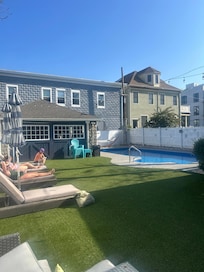 large (16x36) in-ground NO DIVE salt water pool (Pool open Memorial Day weekend and closes early September after Sea Hear Now music festival ). Pool heater will be set to 83. Please note photos there is no additional fence around the pool. Children must be supervised by an adult at all times when in backyard.