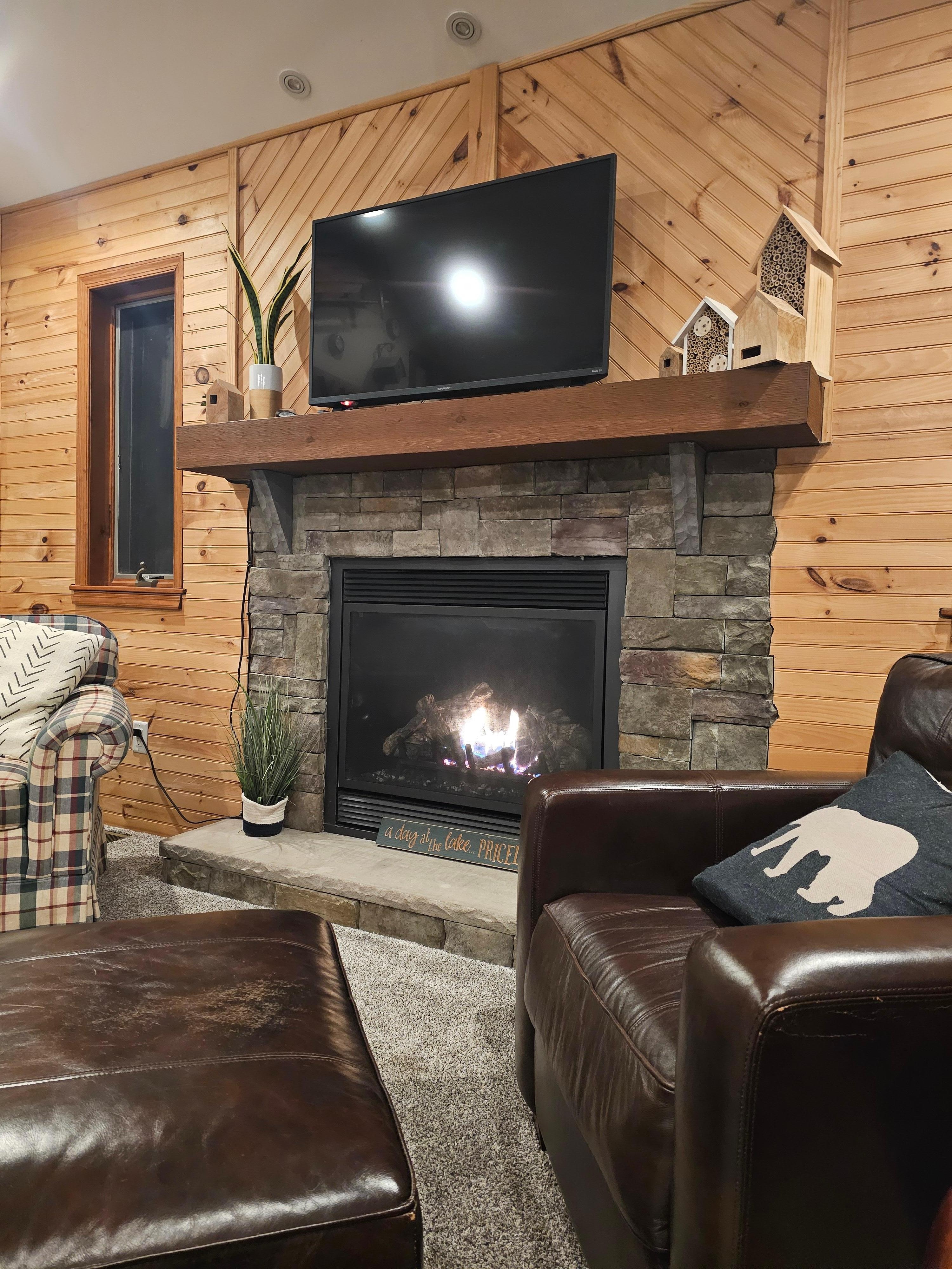 The cozy living room is decorated with funky pieces, offering lake views, a great gas fireplace, lots of seating and plush carpeting.