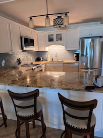 Cook in the spectacular kitchen with granite counter tops which is equipped with new stainless-steel appliances, and a vast assortment of bowls, cookware, gadgets, flatware and utensils to create that great beach meal. Attached and adjacent to your kitchen are a breakfast bar and dining table so family and friends can be together while meals are made in your kitchen away from home.