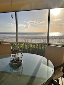 The living room includes seating for up to six with a 55-inch flat screen TV and wireless Sony surround sound stereo that you can hook up to your own device. A desk and wireless printer are available for your use. Through the living room and master bedroom you can enter the 26-foot beach front private balcony to enjoy the glow of the sunrise with your morning coffee or the amazing sunsets and a late-night beverage. You have a panoramic unobstructed view of the white sandy beach and the Gulf of Mexico.