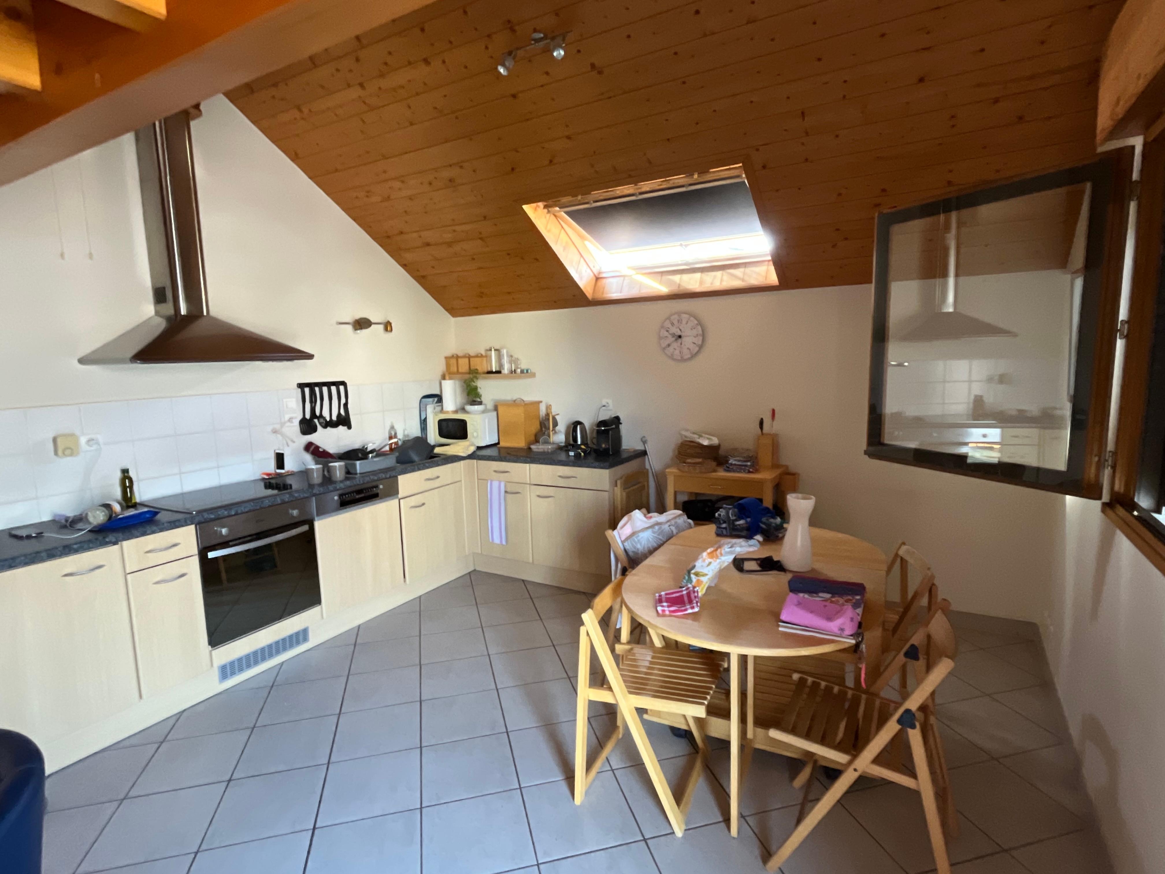 The balcony is big enough for family-dining outdoors during the warm weather. The apartment is designed in the traditional Alpine style including sloping ceilings and exposed beams. The kitchen area includes an oven/grill and hob, fridge with freezer compartment, microwave and lots of pots, pans and dishes if you want to make the most of all the fresh produce you can buy at nearby supermarkets and superstores.