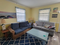 Captain's Cabin OBX welcomes you with its thoughtfully curated amenities, including queen size memory foam beds, crisp white linens, alarm clocks boasting calendar display and temperature readings, USB charging ports, plush bath towels, and a well-equipped eat-in kitchen with a charming breakfast bar area perfect for a quick bite, relaxing conversation while preparing dinner, or a fun game night. The light-filled living area beckons with ample seating options, complete with a full-sized pullout sofa bed.