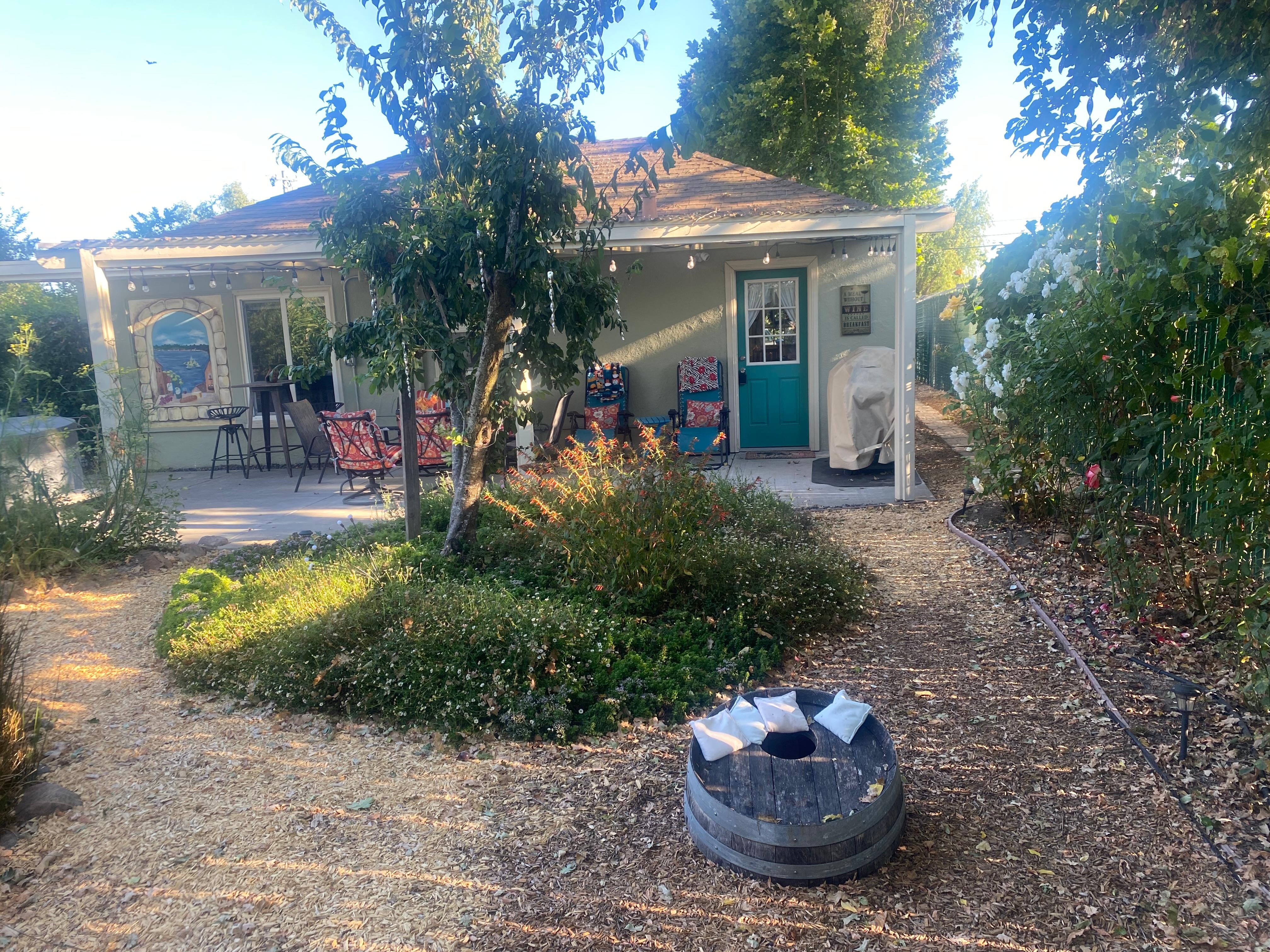 Come enjoy your separate beautifully appointed Cottage centrally located between Santa Rosa and Sebastopol. Queen sized bed in the bedroom, full bathroom with a large living room is the perfect getaway for a couple or family with young children .We have a toddler cot or portacrib that we can set up for you and there is a crib in the small office/playroom. Fully stocked kitchen, large living room with sofa, two rocking chairs, and a large flat screen tv and XBox. Your private back patio looks out onto a beautiful rural setting and has a propane barbque, hot tub and lovely dining table with overhead heater. There are reclining lounge chairs for relaxing. You can have a fire in the fire pit to complete the evening. We have a corn hole set up for the competitive guests and are very close to a 7 mile bike trail between the cities of Santa Rosa and Sebastopol. Our baby vineyard is 9 years old and the winery is open for tasting by prior arrangement! A vegetable garden, fruit trees and lots of beautiful flowers provide country ambiance and beauty.