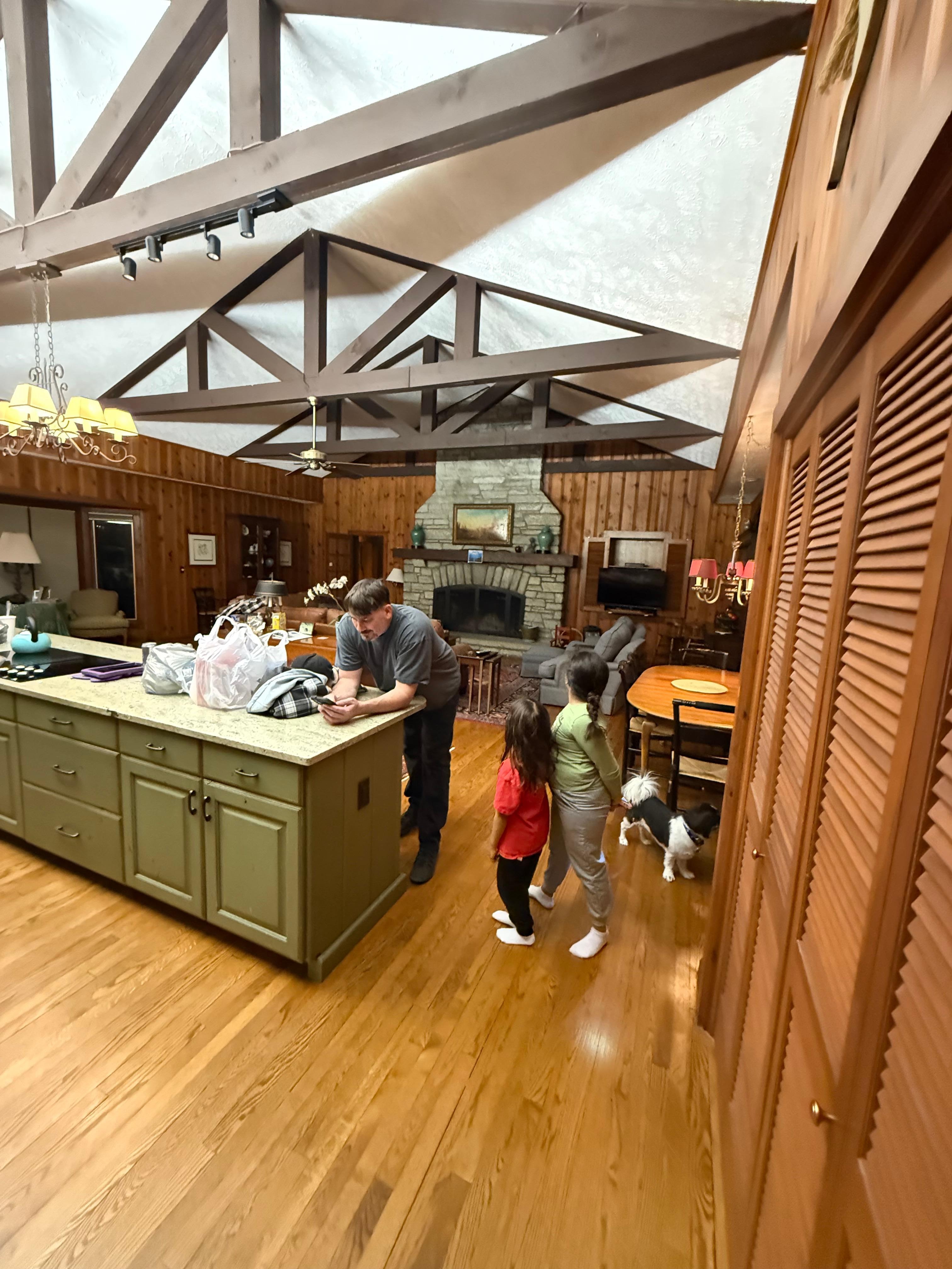The main level boasts a large living room with exposed beam, cathedral ceiling, an enormous decorative fireplace , cable TV, plenty of comfortable seating, and bay windows bringing the front and rear mountain views right into the room. The dining area is located near the rear bay window, and the fully-equipped kitchen opens into the living room as well. Behind the kitchen are a large master suite with King-sized bed, cable TV, and private bathroom with shower, and a suite with two twin beds and private bathroom with tub and shower. On the other side of the living room behind the massive fireplace are a large gameroom with pool table and two twin beds, and another master suite with queen bed and private bathroom with shower.
