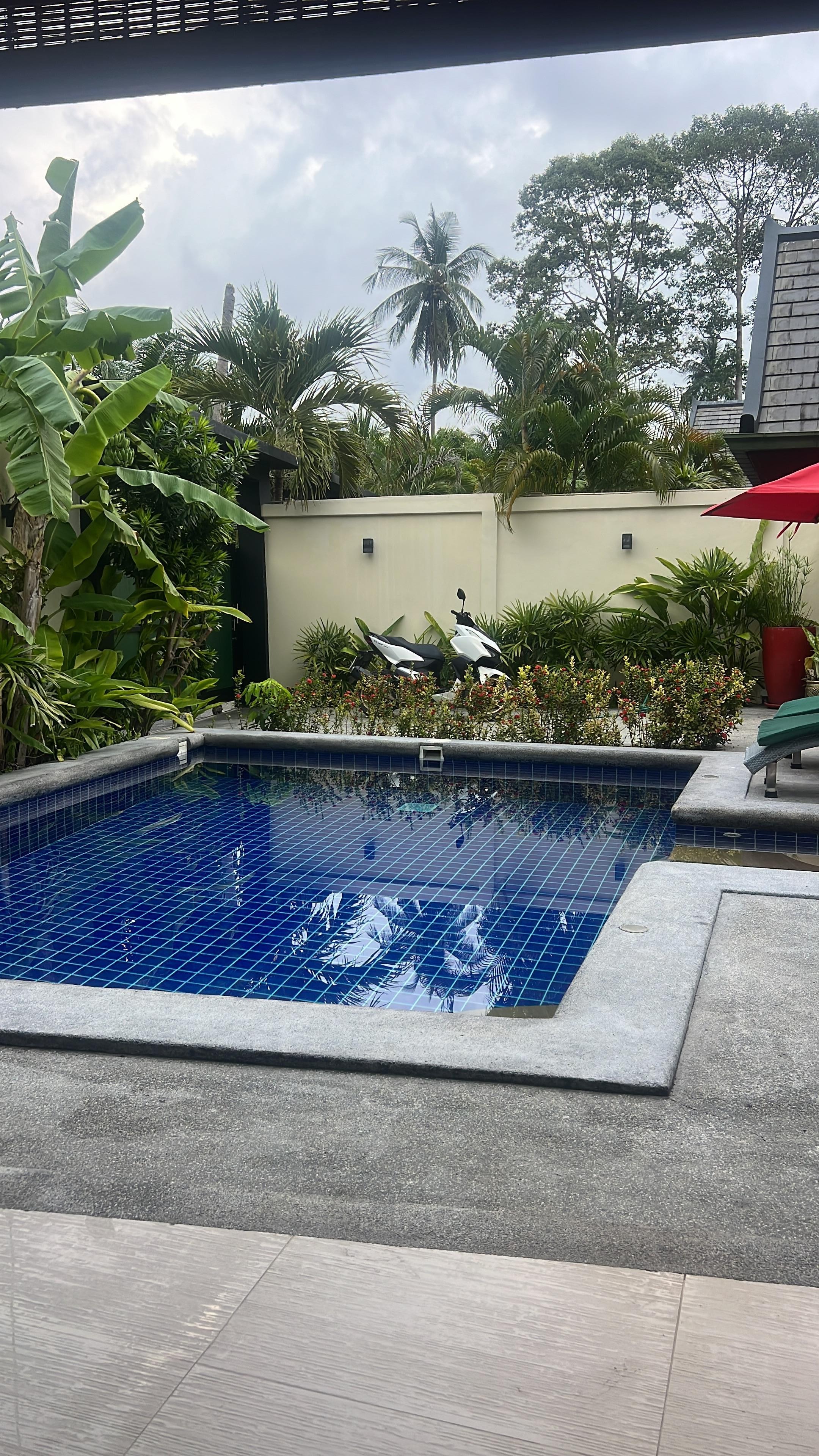 The villa has a beautiful blend of living, with 2 Living and Dining areas, one is outdoor and the second one is indoor with air conditioning. Both of these areas have a large SMART TV with Netflix, Youtube, etc. There is a fully fitted Western style Kitchen, en-suite Bedroom with air conditioning, salt water swimming pool with a jetted seating area, Lotus pond with tropical fish and turtles, together with a barbecue and lush tropical garden.