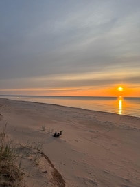 The Sunset House is nestled in the sand dunes of Great Sand Bay, the house derives some of its power from solar panels. Go to bed and wake up to the peaceful sound of the waves hitting the beach. You will enjoy the spectacular views of Lake Superior sunsets (always different) in the evenings and later at times the Northern Lights. For the early riser a walk down on the beach you can also see the sunrise to the right or east. First floor of the Sunset House is a large carpeted living area and game room with Satellite TV with hundreds of channels, Ping Pong Table, Air Hockey Table, Hockey Foosball table, Dart Board and Stereo system. There is also a spare Refrigerator Freezer for extra groceries. The main floor Has a monster Fully Furnished kitchen with everything you need to prepare and serve most any meal. There is also a washer & dryer, dining room, full bathroom with shower and bath tub, fully furnished carpeted King Bedroom, Carpeted entertainment Room with 60" plasma TV with 100's of channels a DVR, VCR with hundreds of movies games, toys and puzzles. Very comfortable Lazy Boy full size sofa sleeper. Carpeted living room with Lazy Boy rockers and recliners full size pull out Futon, Library area with many history books about the area and many other book topics. Upstairs 2 fully carpeted fully furnished King Bedrooms one with walk out Glass balcony with table and seating for 2 over looking the beach and Lake Superior. Full Bathroom with shower upstairs. Huge Deck with Log and Wood Furniture Large Picnic table 1 gas grill and 1 charcoal grill. Enjoy the Sunsets, fires on the beach in the fire pit, Northern lights, or get up early and enjoy the sunrise on the 2 person swing with table or the other wooden beach furniture on the sand dunes overlooking Lake Superior.