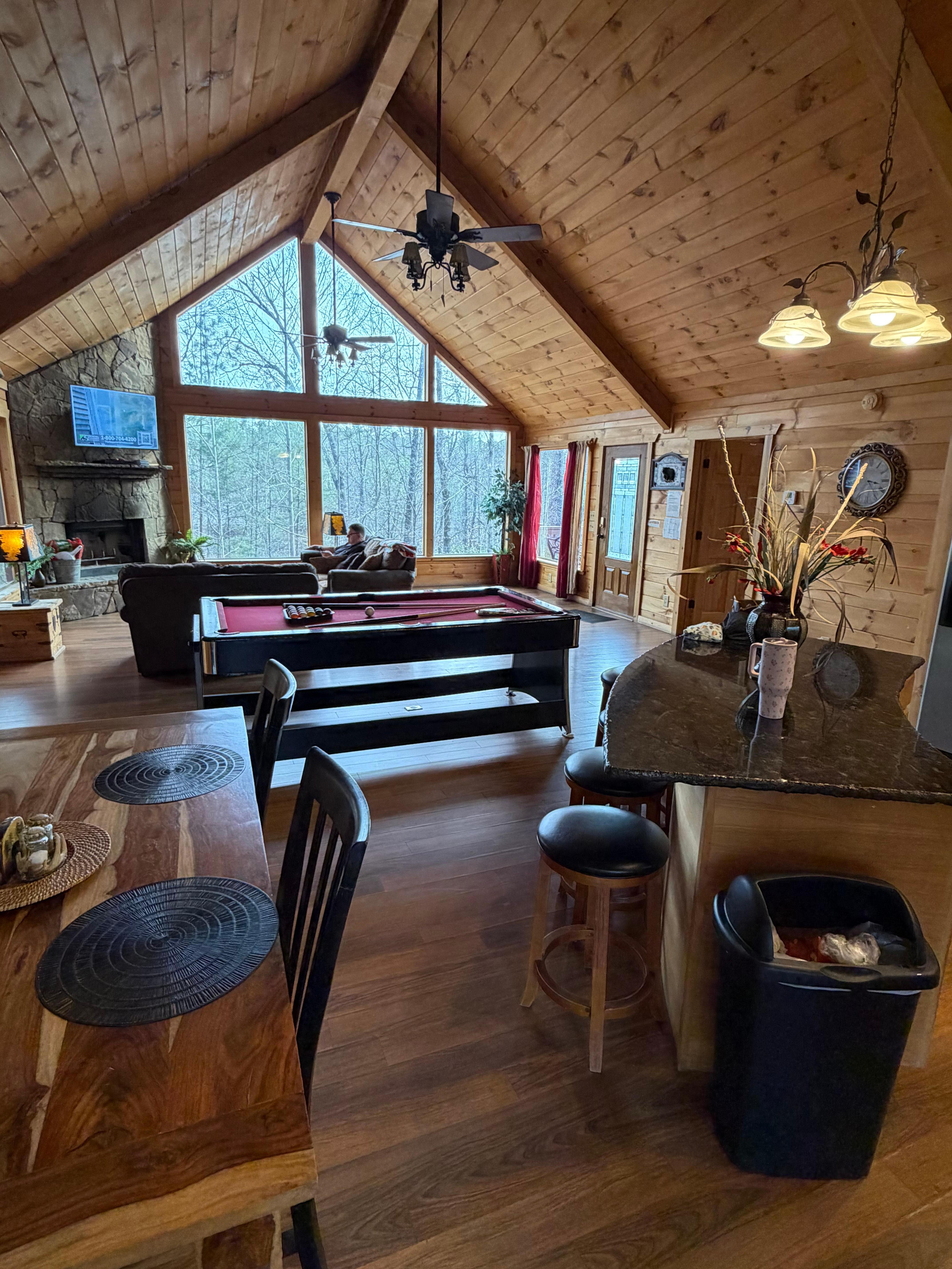 This home's covered deck is a perfect space in which to relax. With an additional outdoor wood-burning fireplace, lots of seating space, a private hot tub, and views of the natural beauty, it will be one of the best parts of your vacation. And if it gets too chilly, don't forget that you can retreat back inside to play a game of pool!