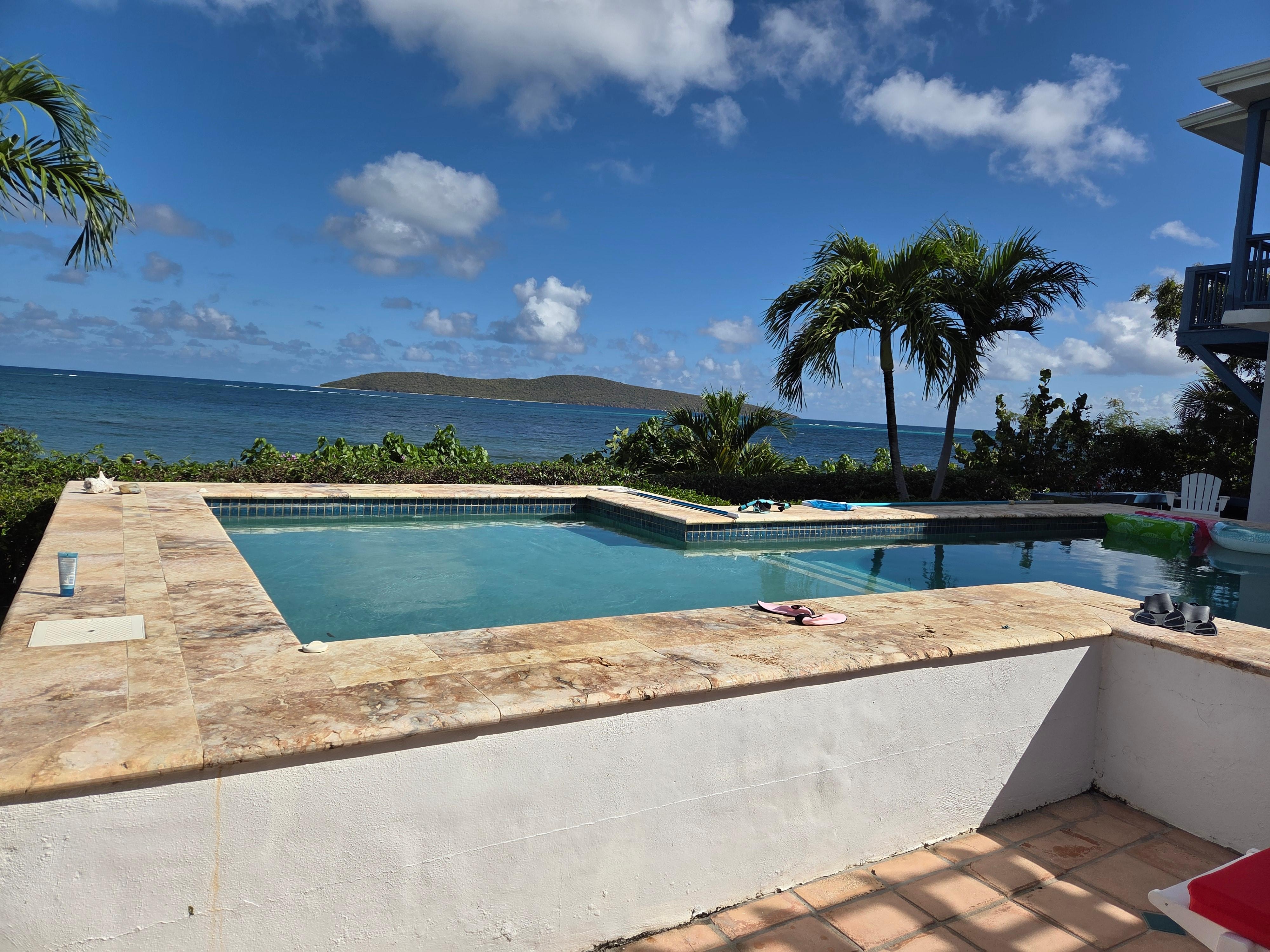 Across the pool deck is the 2 story guest pool house. The upper bedroom has king bed, full bath across the hall, air conditioning, ceiling fan & french doors that open to its own balcony with a great sea view. The lower level has a full size bedroom w/sitting area, air conditioning, ceiling fan, a small galley style kitchen & its own deck. The lower level bedroom has a queen size bed and french doors that open to the deck outside.