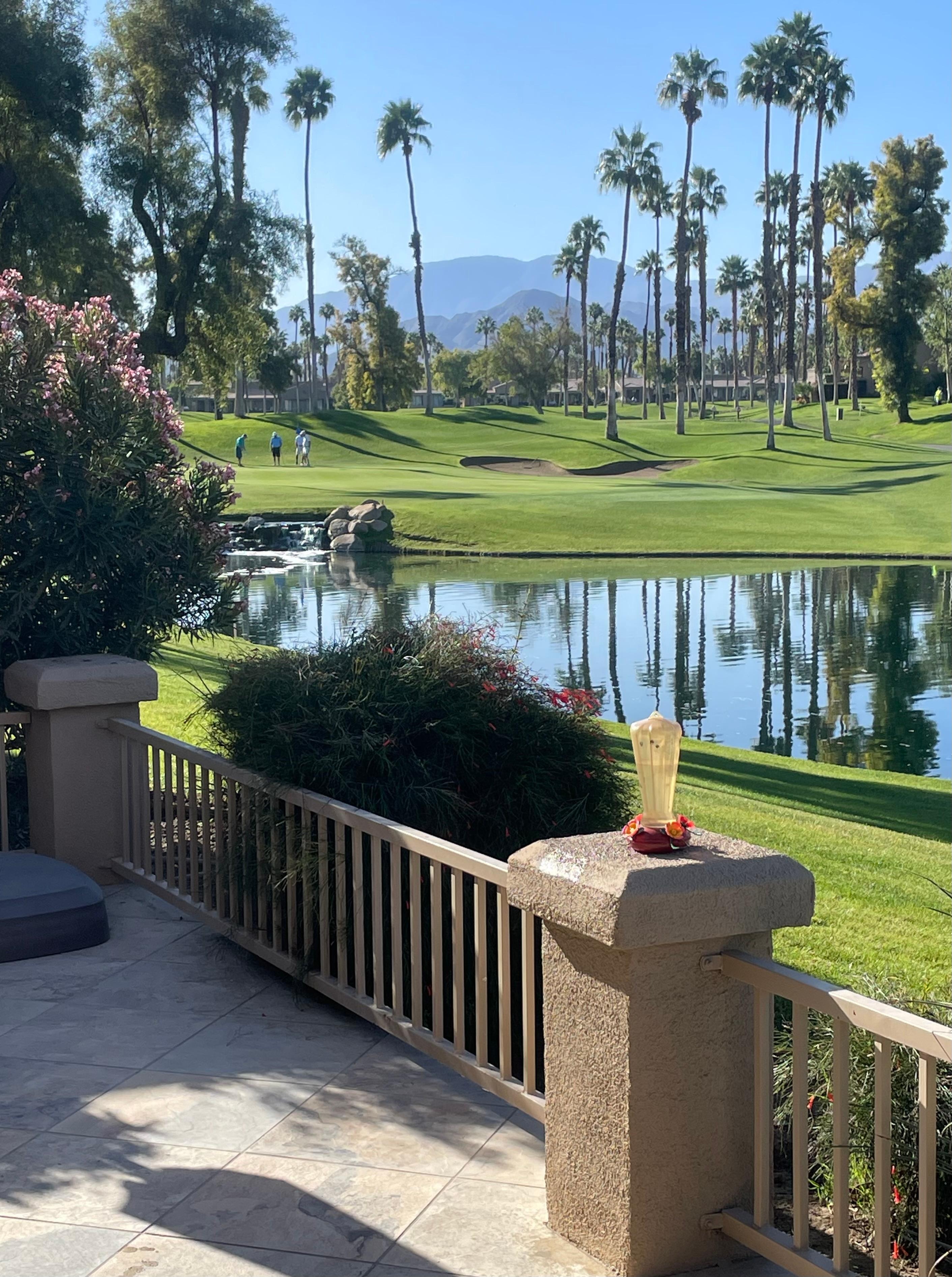 The beautiful patio opens to a bright green golf course and a small lake. Community pool and spa only 200 feet away! The back patio features a large sectional with a fire feature and two chaise lounges to catch some sun! The front patio features a 4 person dining table with a 4 burner BBQ! Catch some sun on the chaise lounges, or take refuge in shade under the patio umbrellas.
