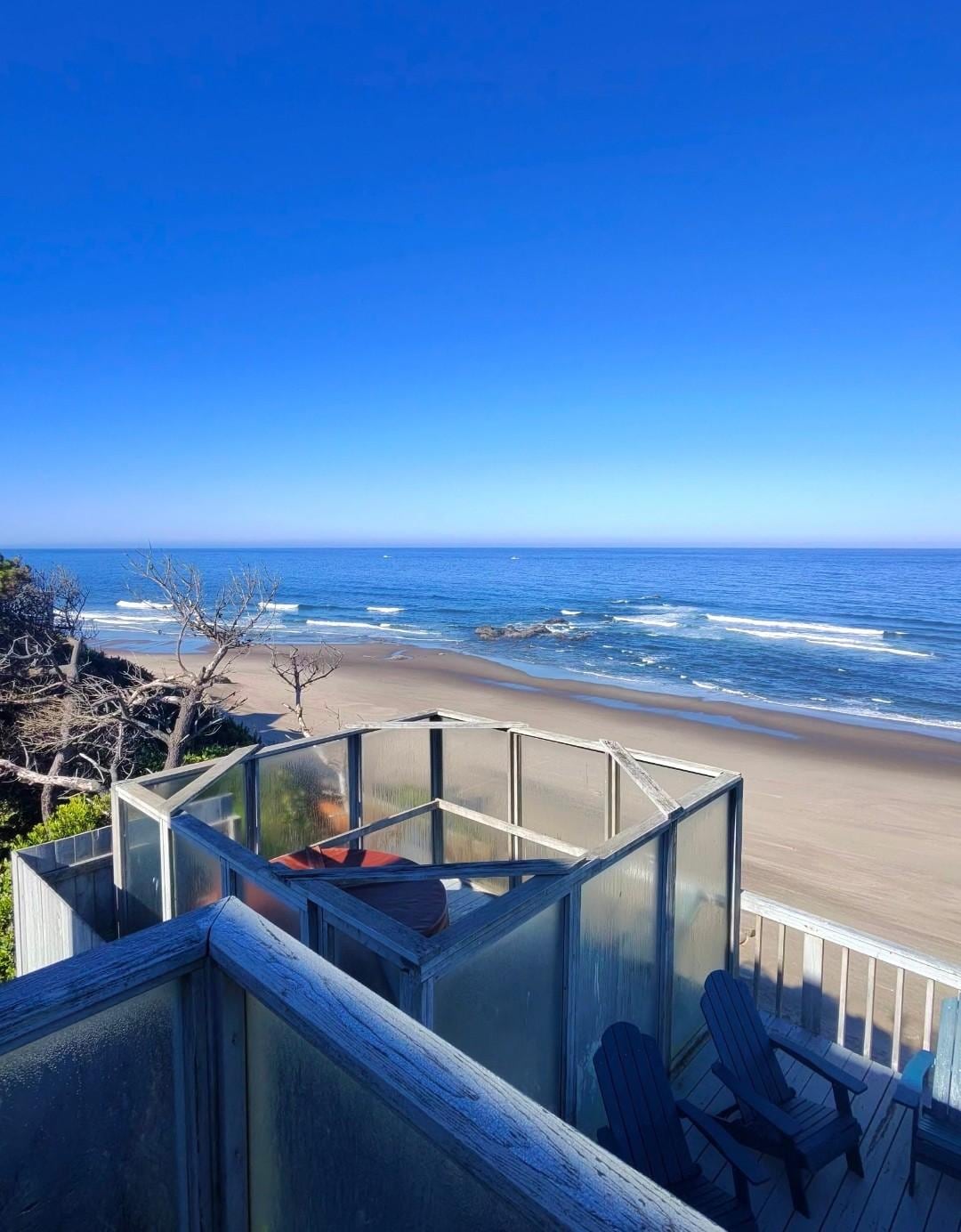 This unique oceanfront home makes it easy to enjoy the perfect coastal stay with friends and family who love gatherings but value their private space. Three distinct units with separate living spaces—one two-bedroom, one single-bedroom, and one studio, each with its own entry from outside, kitchen or kitchenette, bathroom, TV, and gas fireplace —share a huge oceanfront deck with panoramic views, a Weber grill, and a wind-screened hot tub! Each space has its own private entrance, making this a terrific way to share a vacation with multiple families. Nelscott Anchor House has been thoughtfully updated, but retains its historic 1940’s charm, with beadboard wainscoting, tile flooring, and an enchanting beamed, vaulted ceiling. Each level has its own deck and ocean view, with stairway access to the main-level deck, and a set of stairs down the cliff-face that gives you direct beach access. The Olivia Beach access is just down the street if you prefer a wider staircase, and it’s also just a short drive to Nelscott Beach and many other Lincoln City attractions. If you enjoy privacy, but want to share coastal time with a group of friends or family, Nelscott Anchor House provides an adorably retro space and fantastic ocean views for a memorable stay in Lincoln City!
