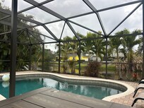 Out the patio doors, you'll find a beautiful screened-in heated pool with plenty of room for everyone to relax, in or out of the water. A large dining table and gas grill make dining al fresco easier and more fun than eating out! String lights hang around the cage for magical evening hours enjoying the warm air and even the warm water after the sun goes down.