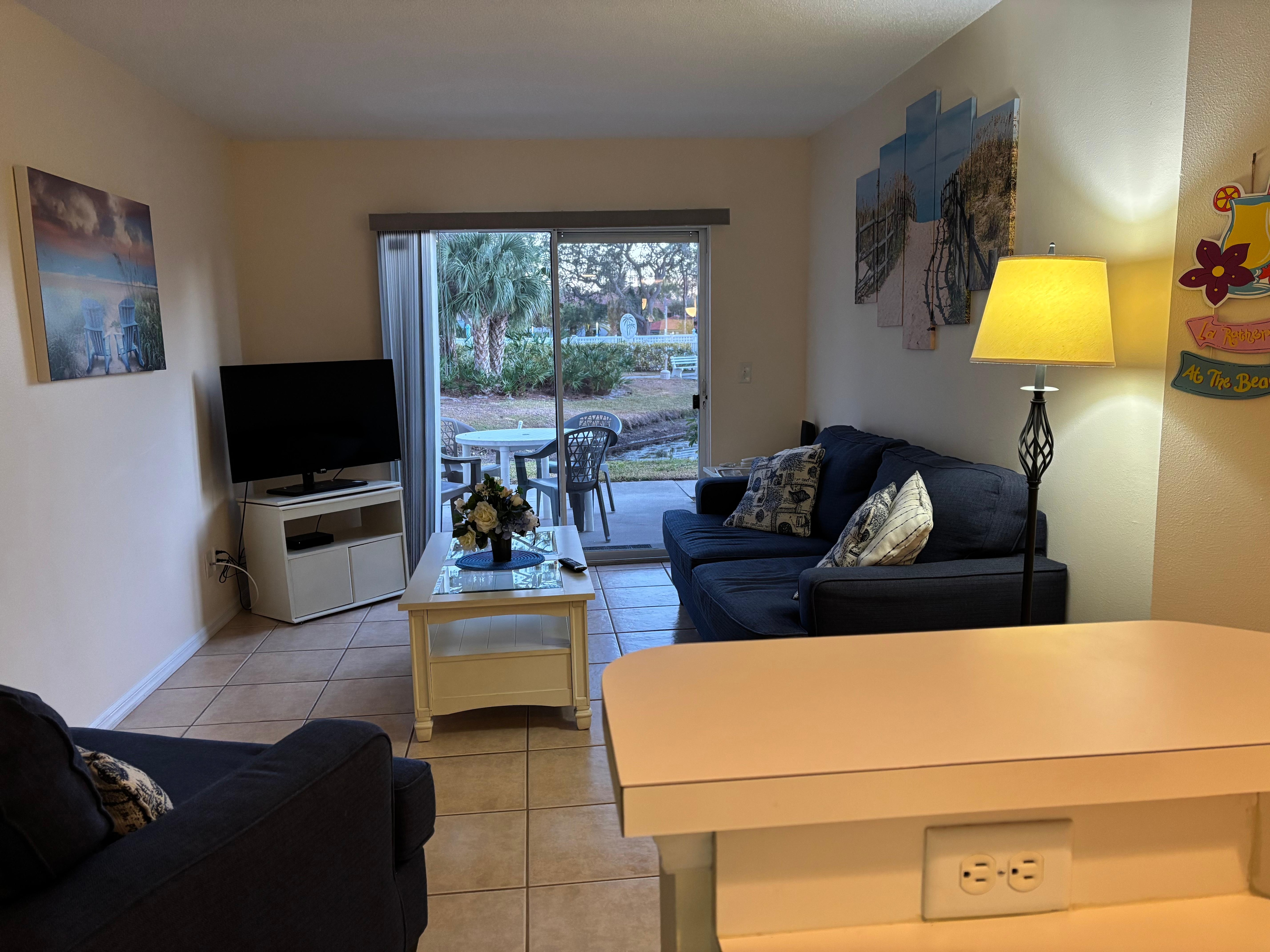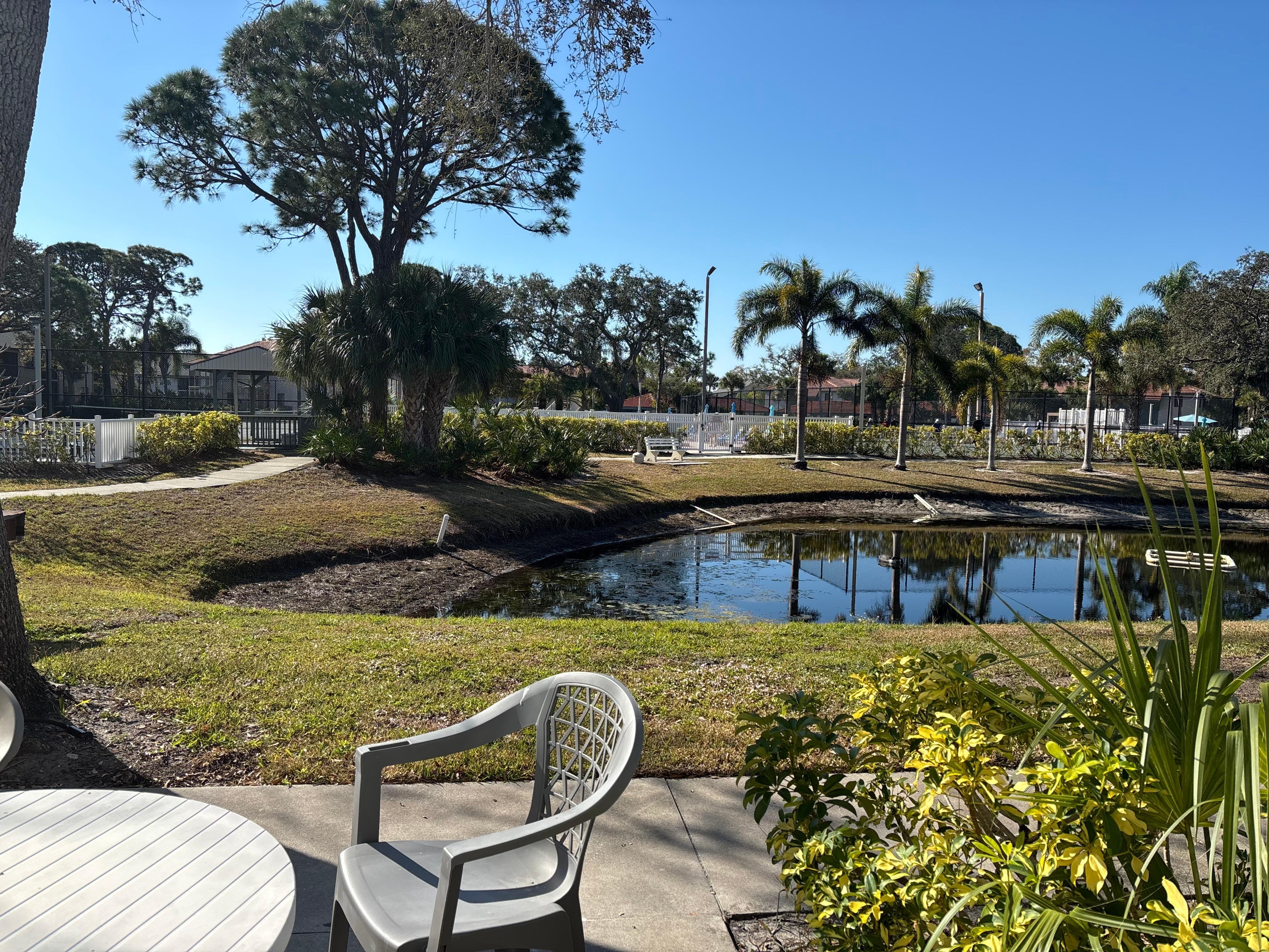 Condominio en la planta baja de fácil acceso con salida al patio con vista a la serina del estanque y las piscinas.