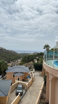 Desde la sala de estar hay puertas que dan a un balcón sombreado de naya con vista al mar Mediterráneo, equipadas con mesa y sillas para cenar al aire libre, una barbacoa y tres grandes terrazas que incluyen una terraza en la azotea con trampa solar con vista hacia El Portet y el mar.