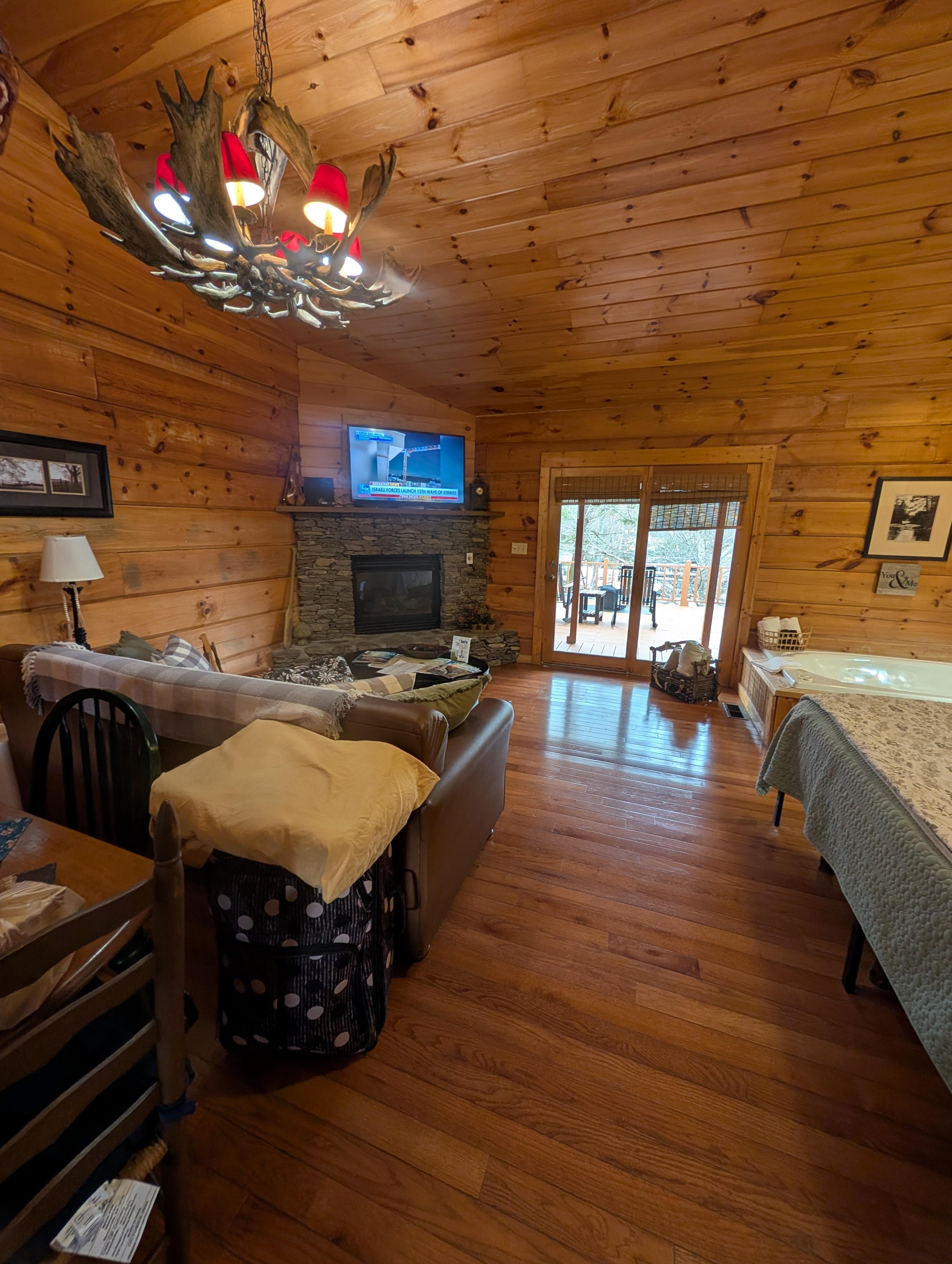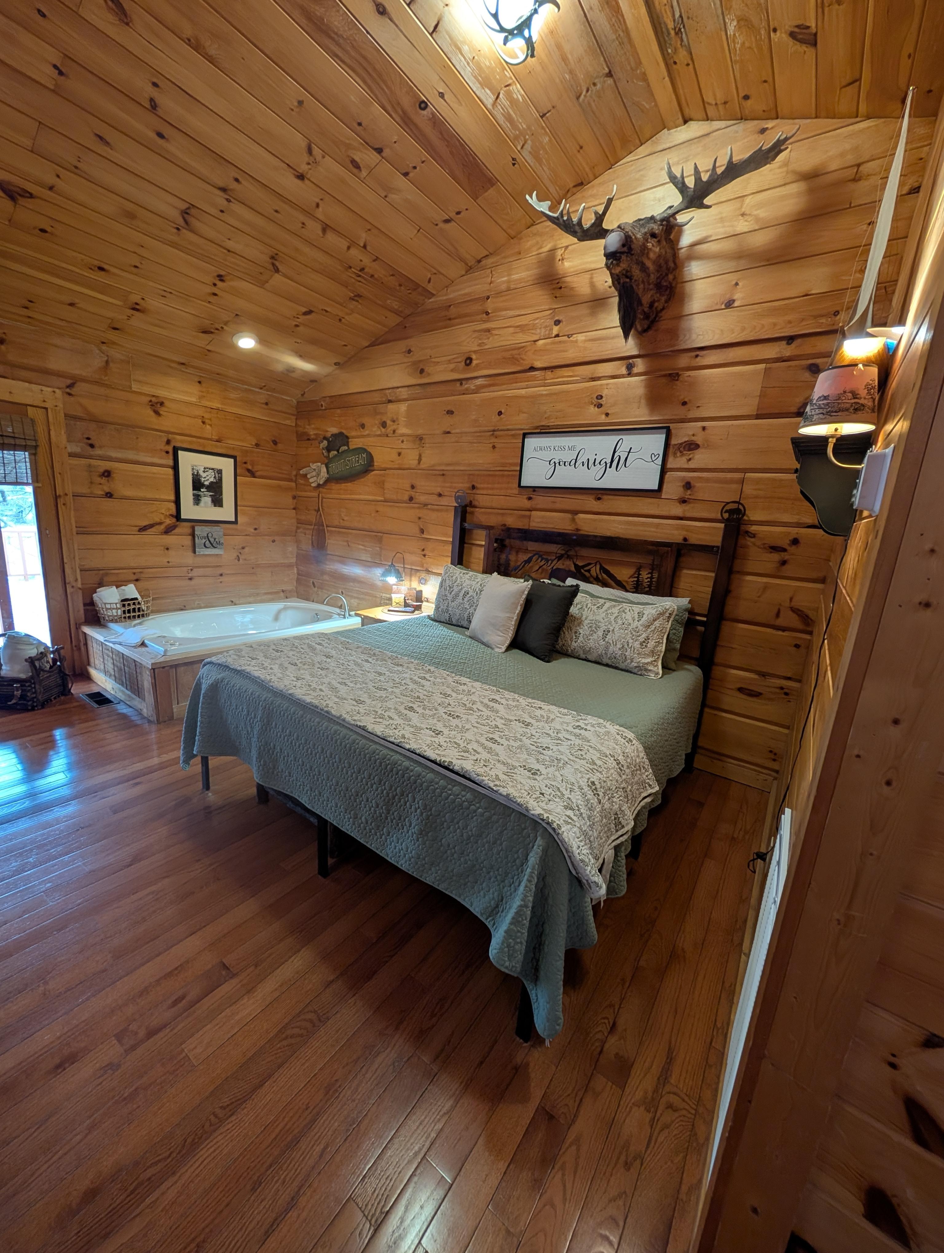 River Bend es una cabina de estudio con baño privado. Ofrece una hermosa cama de gran tamaño con cama de matrimonio, un baño con jacuzzi, sala de estar con chimenea de gas y cocina totalmente equipada. Esta cabina tiene muchas características únicas, como encimeras de cobre y su propio pozo de fogata.