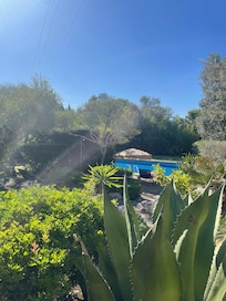 The nicely shaped pool is located at the back of the Villa, has both ladder and roman steps access and is located at the back of the Villa. There is grass on one side of the pool and cement terrace the other. Nearby the pool there are sun beds, together with small table and chairs to take enjoy a lunch, or cool drink under the shade of the trees. There is also a pool side shower next to the pool.