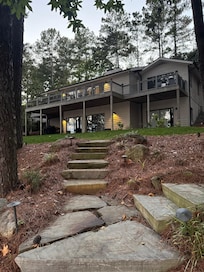 Nuestra casa de concepto abierto recientemente renovada de 3,300 pies cuadrados tiene (4) camas y (3) baños y duerme cómodamente diez (10). Las características incluyen ... hermosa chimenea de gas de piedra apilada, plano de planta de concepto abierto, vistas al lago desde todas las habitaciones de la casa, (2) suites principales, nueva cocina de acero inoxidable con encimeras de cuarzo y estufa de gas, spa como baño principal con bañera de burbujas , nuevo HVAC, una gran terraza trasera expansiva con vista al lago, y nuevos jardines delante y detrás. Nuestro paquete Direct TV con AT & T WiFi incluye todos los canales deportivos de ESPN. La casa tiene un (2) estacionamiento para automóviles y mucho estacionamiento extra para sus invitados. Nuestro gran lote arbolado permite un fácil estacionamiento de remolques de botes y motos acuáticas. Nuestro nivel de abajo tiene un segundo dormitorio principal, un dormitorio adicional grande con 2 camas queen, una segunda sala den / rec para los más pequeños y una nueva cocina. También hay 2 sillas plegables grises acolchadas muy cómodas en el armario del vestíbulo de arriba para cualquier necesidad de asiento adicional.