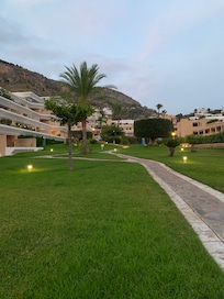 Dos grandes piscinas en un hermoso jardín y en temporada con guardias vivos que las vigilan y protegen.
