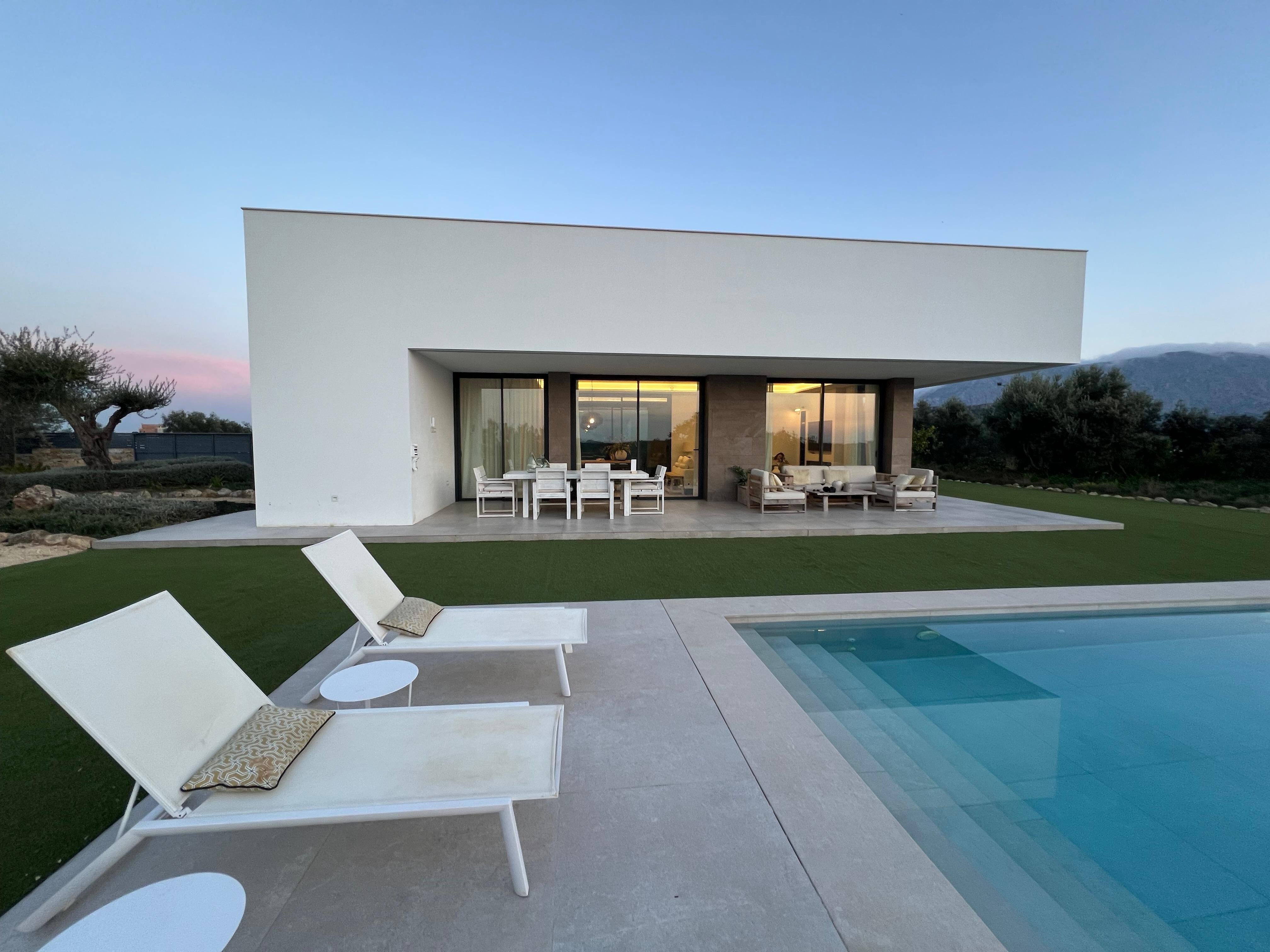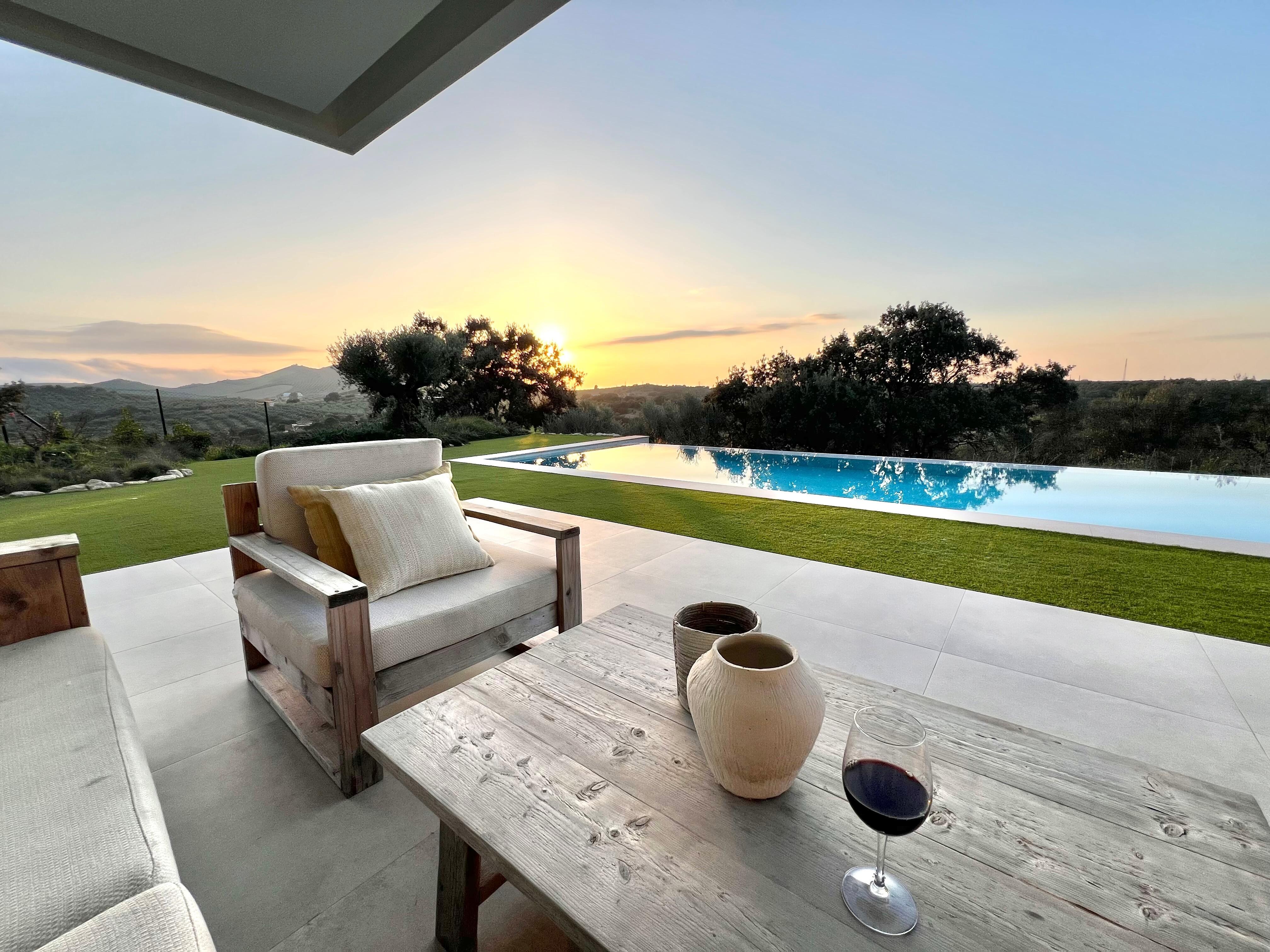 En el exterior, te espera un amplio porche cubierto, ideal para relajarte en la zona de chill out o disfrutar de comidas al aire libre en la mesa de comedor. La piscina privada, rodeada de césped, es el lugar perfecto para refrescarte y disfrutar del sol, todo mientras contemplas las impresionantes vistas a la montaña.