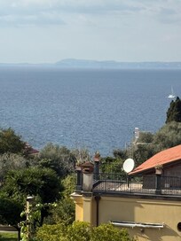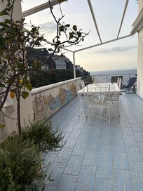 El apartamento tiene una exposición fantástica, con amplios balcones todos con vista al mar. La casa es de dimensiones generosas y se compone de 3 habitaciones, sala de estar con comedor y cocina, dos baños completos. El punto focal es sin duda la amplia terraza exterior con vista al mar amueblada con una gran mesa de vietri, seis sillas, dos tumbonas y varios sillones.