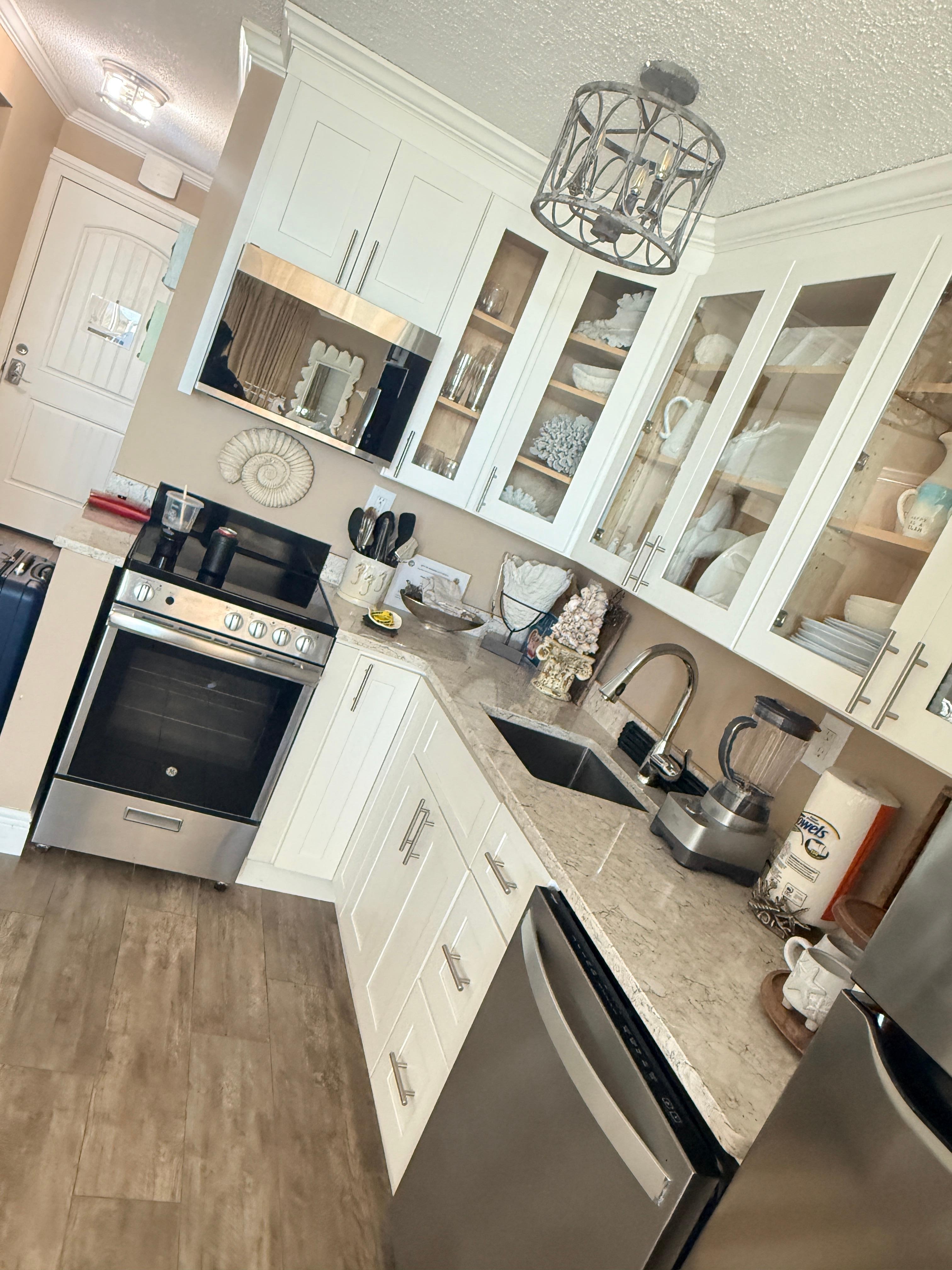 Enjoy a front row beach view in our newly renovated ground floor studio condo, no elevator, and steps away from the beach. Condo has one bathroom with full sized tub/shower, custom made king sized bed, queen sleeper sofa, beach view on bar height dining table, new kitchen with stainless steel appliances and quartz countertops, fully stocked kitchen, walk in closet, coffee bar, 50" smart TV, cable, HBO, NETFLIX and wifi provided by association. Relax in the bar height patio chairs on the attached patio.