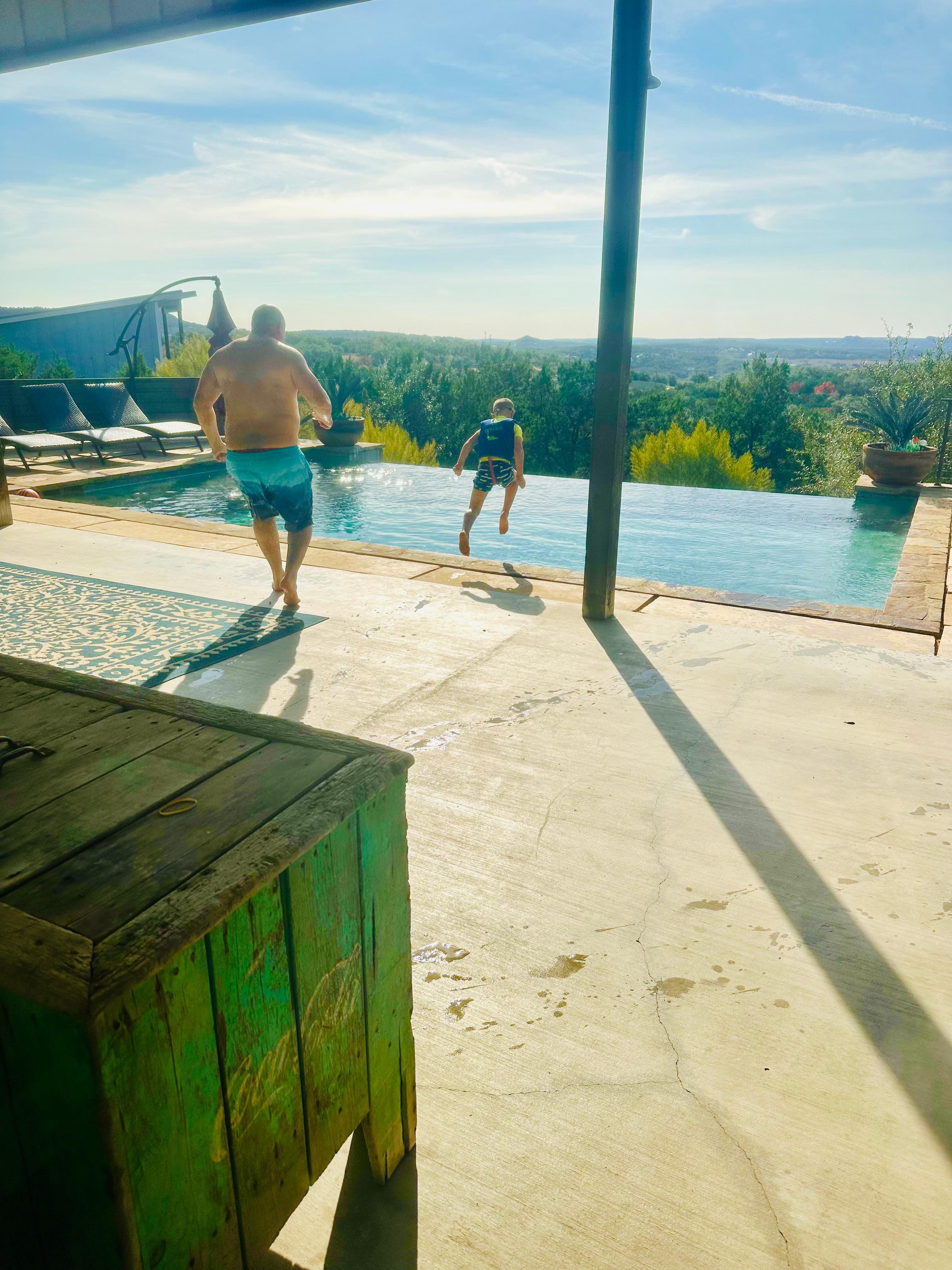 Mire las fotos de los muros de contención que flanquean la piscina infinita. Tenga en cuenta que no hay barandas. Los niños deben ser monitoreados en todo momento y todos deben mantenerse alejados del borde ya que es una caída de 6 '.