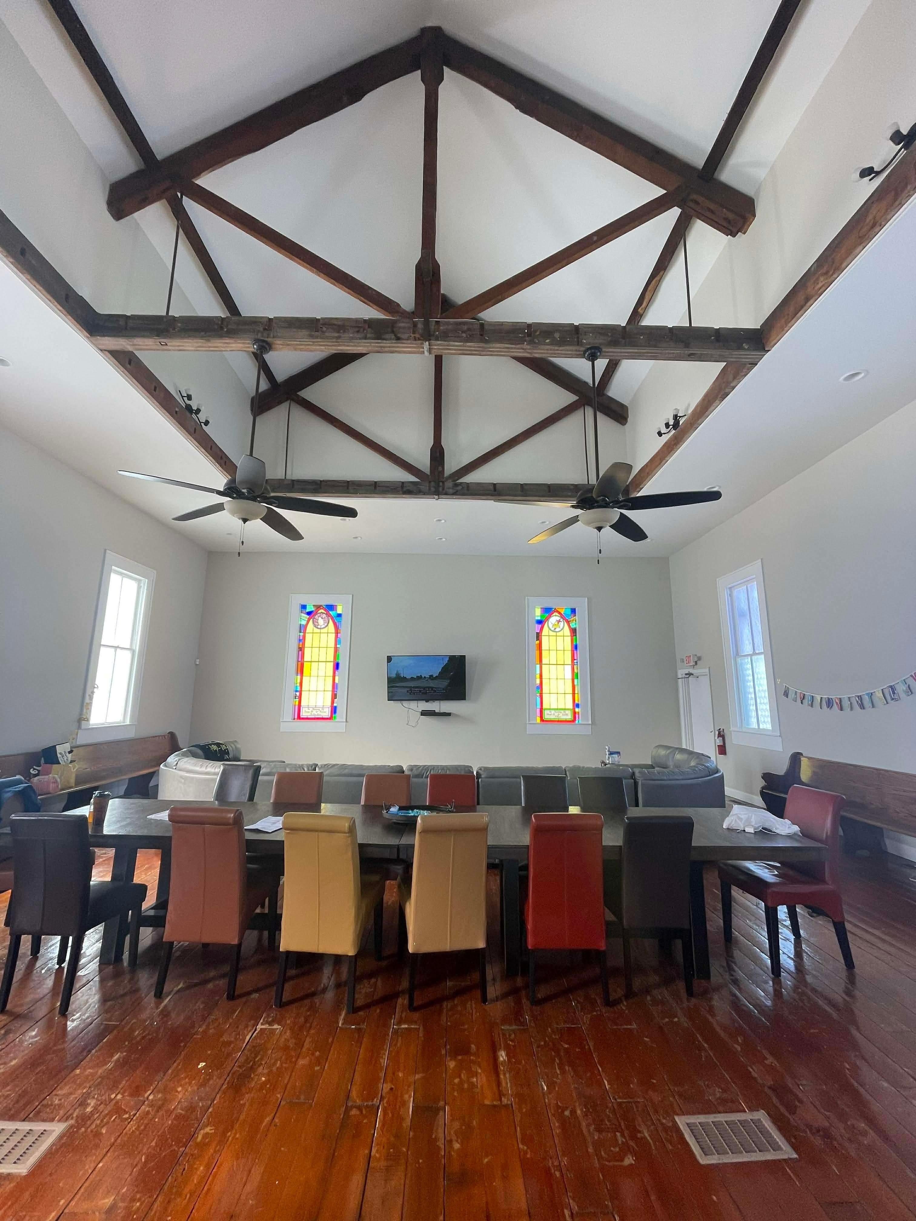 Disfrute de la experiencia Premier en The Sanctuary: el alojamiento y centro de eventos más exclusivo del condado de Ross. Esta hermosa capilla antigua del país construida en 1804 ha sido remodelada para reuniones y pernoctaciones o estadías prolongadas. Desde la cubierta adjunta, disfrutará de la vista pastoral de una granja de caballos ubicada en las colinas del sur de Ohio. Para su próxima gran reunión, ¡no se preocupe por limpiar su casa! Entretenga a sus invitados en el santuario de 1200 pies cuadrados con techos de catedral con vigas de madera originales. La gran sala se completa con una cocina completa con electrodomésticos de acero inoxidable y tiene asientos para comer disponibles para 20 personas, además de espacio para muchos más en dos bancos de la iglesia antigua, la amplia sección de cuero y otro sofá y sillón de cuero, y un baño completo.