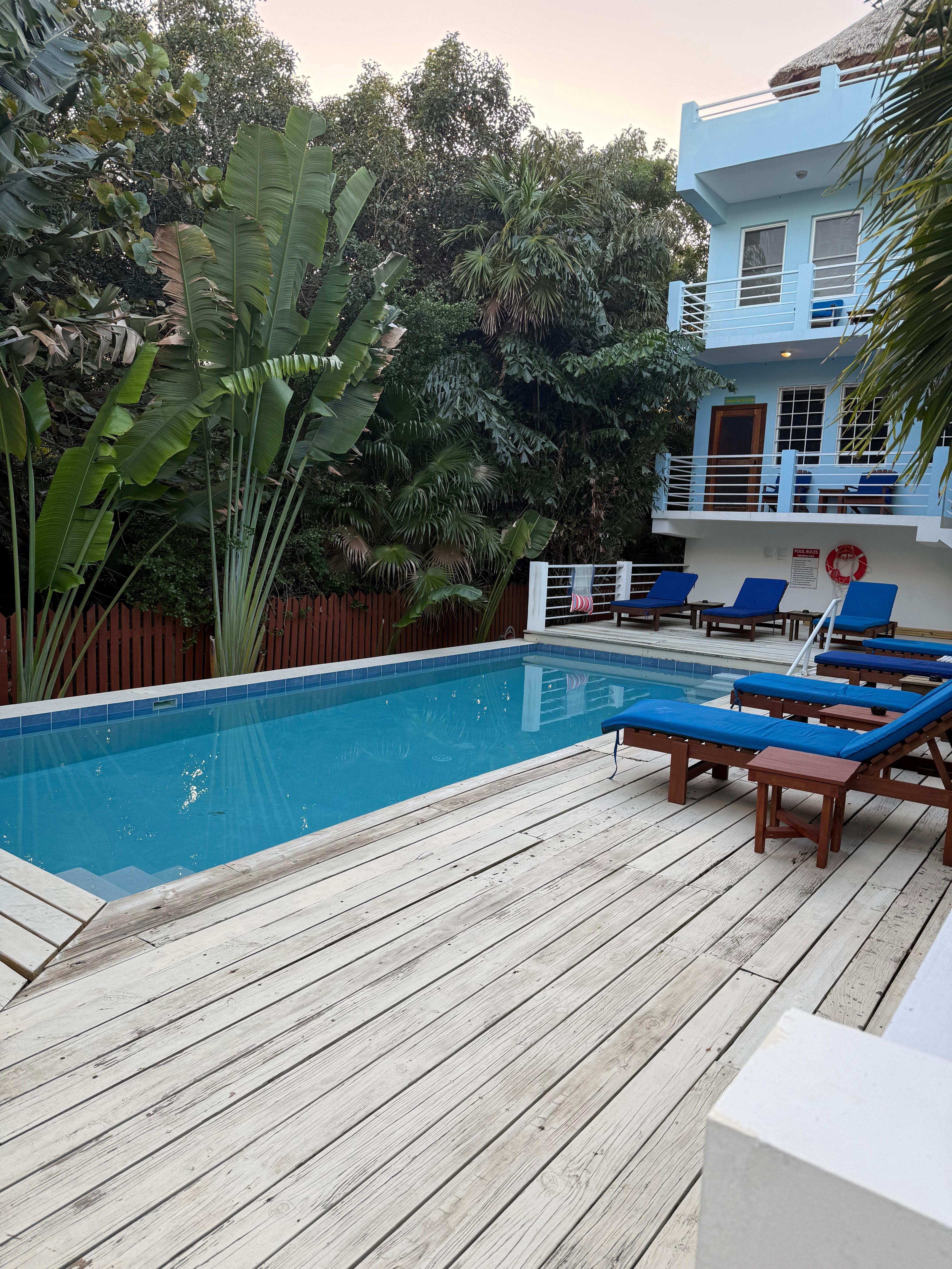 La piscina mide 33'x15 'de ancho con una envoltura de madera Beliziana alrededor de la terraza. Hay varias tumbonas con cojines para sentarse junto a la piscina y relajarse para recargar sus baterías para su próxima aventura. La piscina se comparte con nuestras 2 casas.