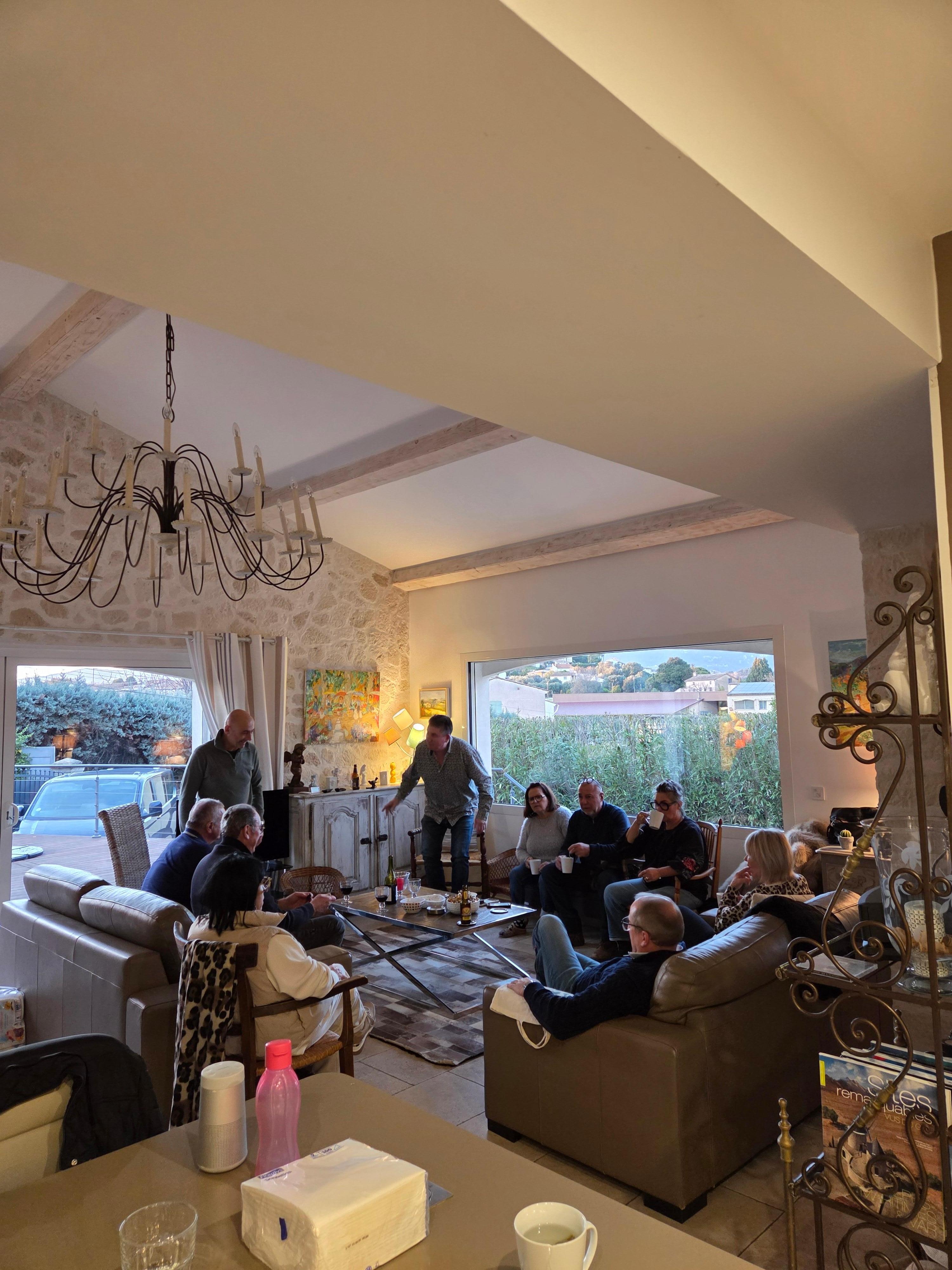 El salón tiene mucho carácter y encanto con su techo de catedral y su araña monumental, así como sus 3 ventanales que permiten una apertura total en la terraza, la piscina y la vista.