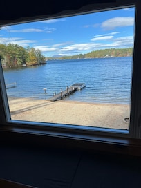 The water here is crystal clear. Not to scare you, but if you look off the docks and into the water, you'll see fish swimming around. Sandy beach, great views. Location, location, location.