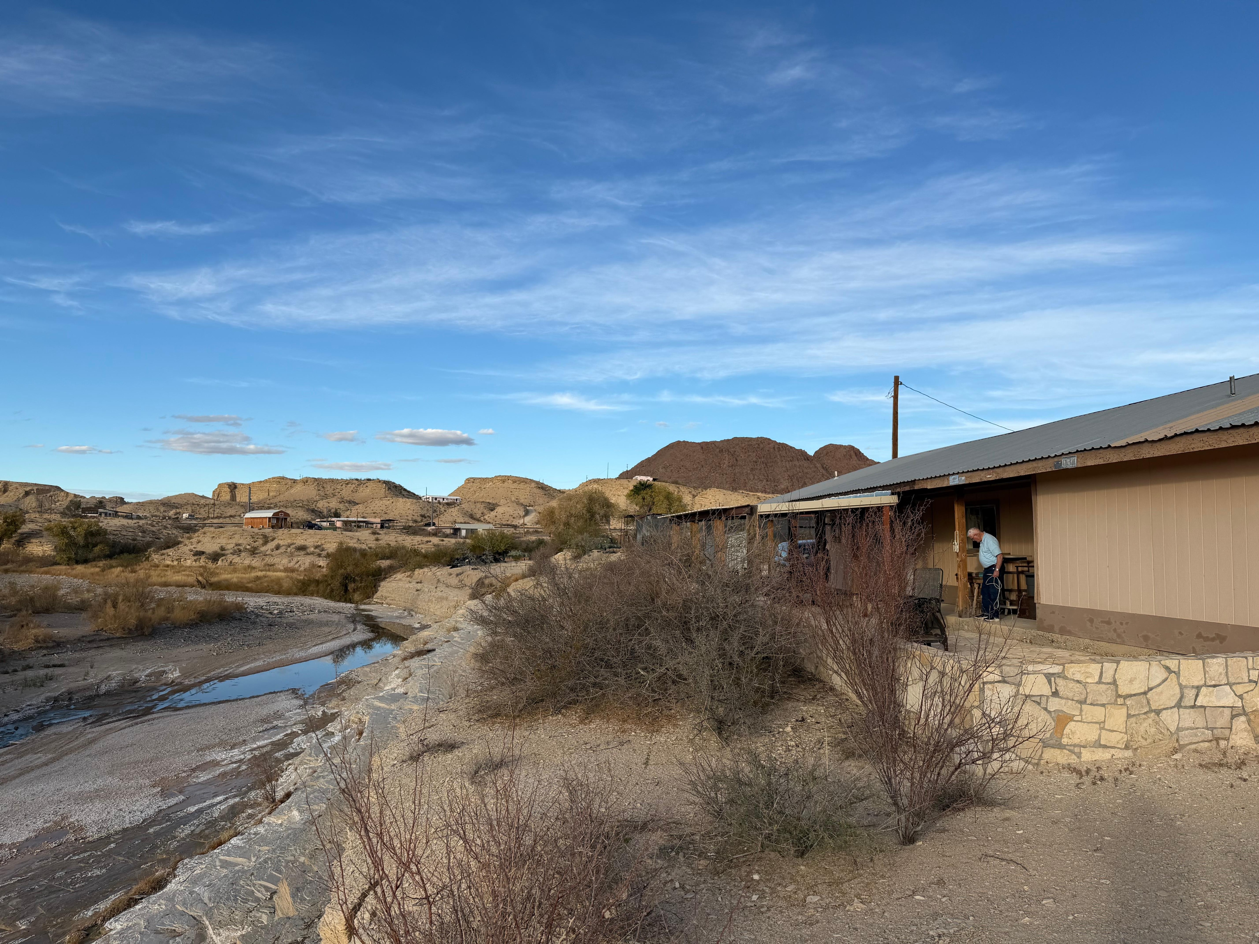 Porche cubierto con vista al arroyo: la característica distintiva de esta escapada de vacaciones es el amplio porche cubierto con vista a una parte alimentada por manantial del arroyo Terlingua. El agua es rara en el desierto, pero siempre a la vista justo debajo de nuestro porche. En el verdadero estilo de Terlingua, también hay una pequeña barra móvil en el porche.