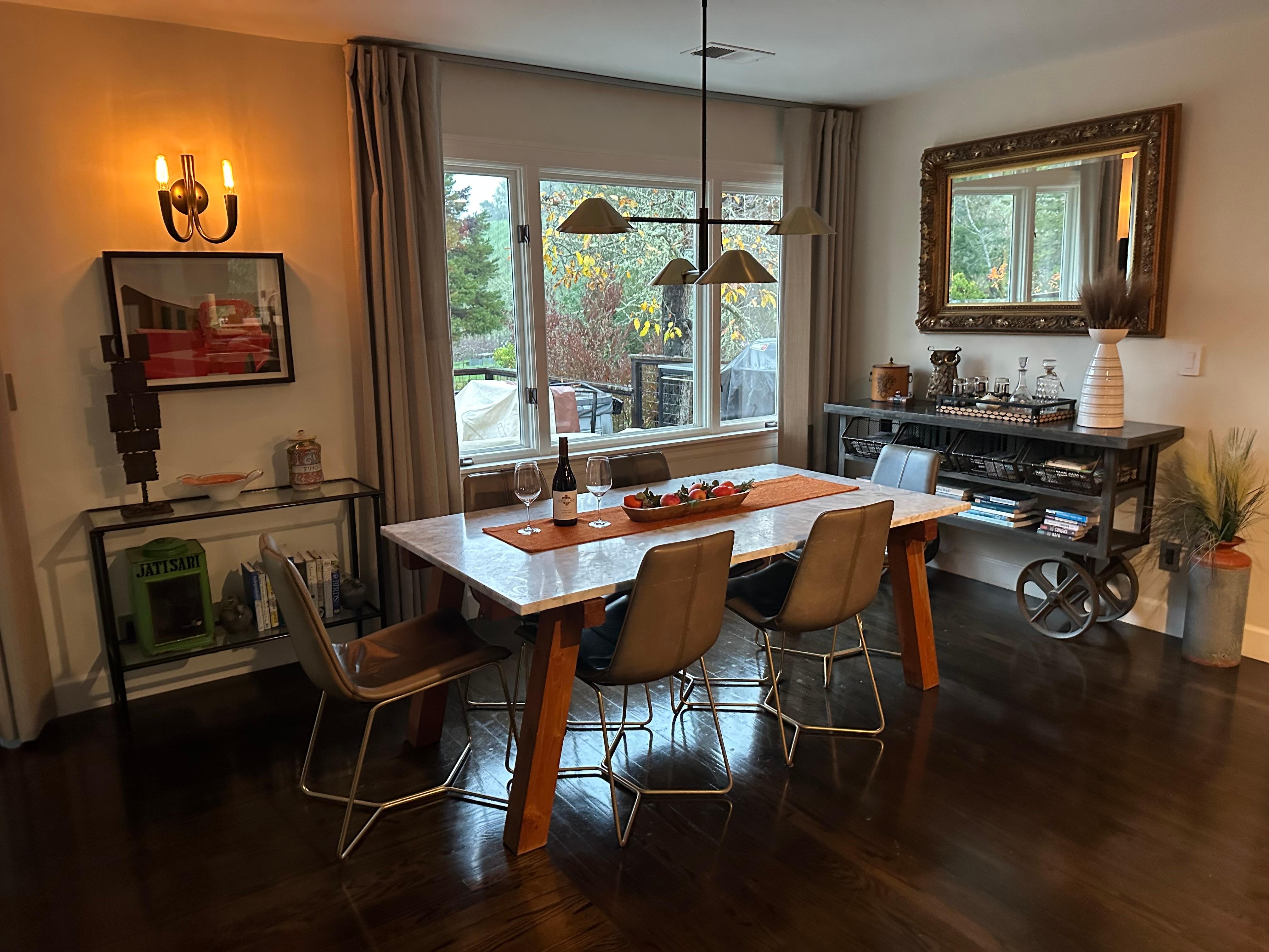 La cocina gourmet, con ricos muebles de madera de cerezo tiene electrodomésticos de acero inoxidable, incluyendo una nueva gama de gas Wolf y horno, nevera grande, microondas y lavavajillas. Ventanas a ambos lados lo convierten en un lugar muy agradable para preparar comidas y una alegría para cocinar. La mesa de comedor de mármol hermoso es un lugar agradable para disfrutar de las comidas largas con amigos. ¿Por qué no disfrutar de productos frescos y gourmet tarifa local de Sonoma y ahorrar dinero en comer!