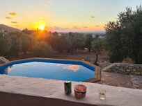 Cenas al aire libre bajo una terraza tradicional con vistas al atardecer sobre el mar Egeo. Tu propia piscina privada. El olivar está junto a la propiedad, refugio ideal con la playa más cercana a solo 5 minutos por carretera.
