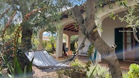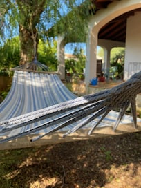 Jardín mediterráneo, con frutales (Punica granatum) y plantas aromáticas. Una hamaca de árbol para relajarse bajo la sombra.