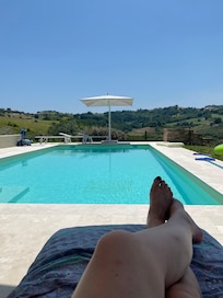 A una distancia segura de la casa es la piscina a la sal del tamaño de mtr 10x5 con amplio solarium en travertino con sillas y sombrillas cómodos, donde se puede disfrutar de la hermosa vista de las colinas circundantes.