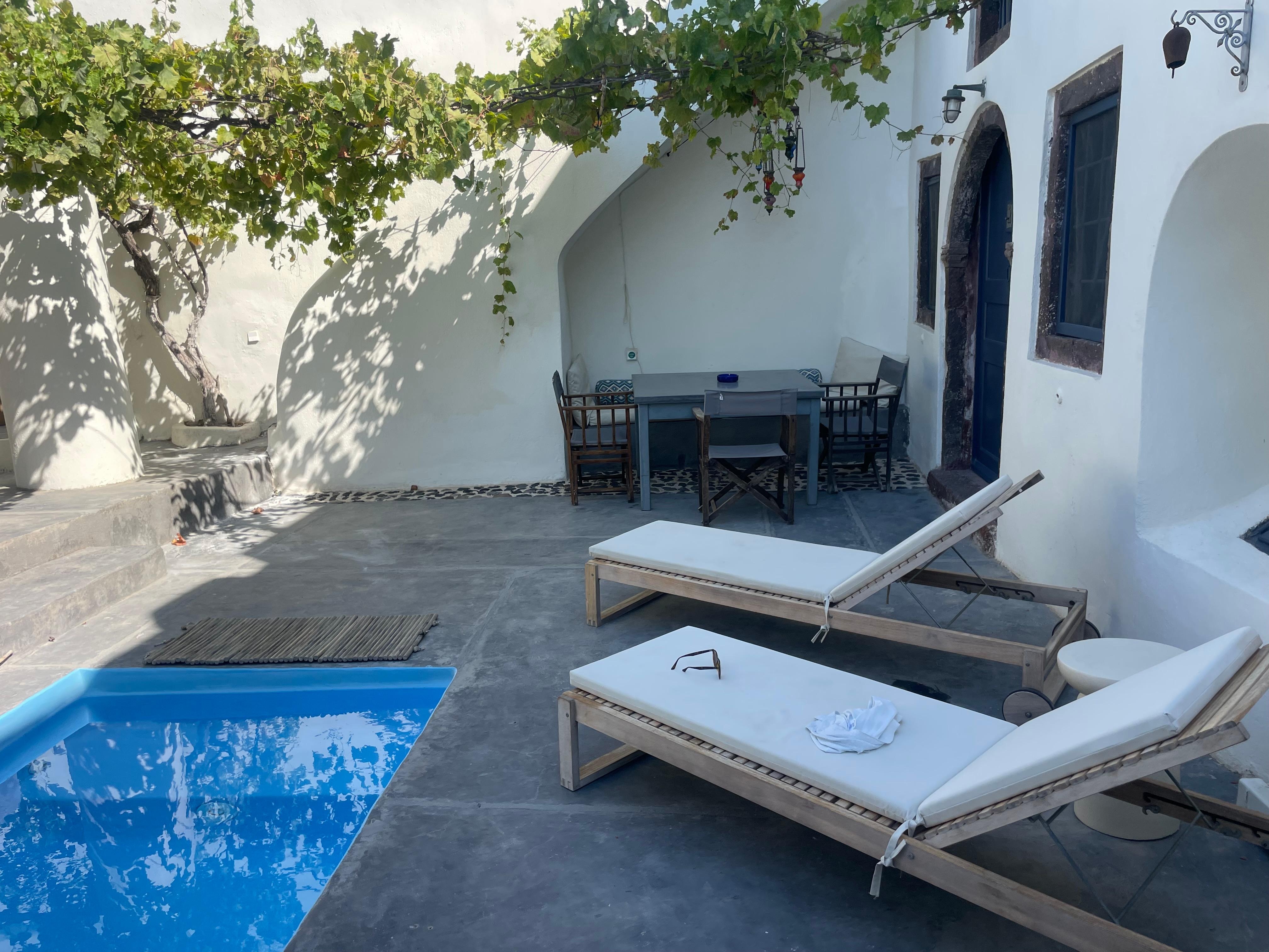 Bodega tradicional restaurada que consta de dos casas separadas con jardín oriental privado y una pequeña piscina en Finikia (Oia - Santorini). Ofrece privacidad, relax, vista al mar y al atardecer desde las terrazas.