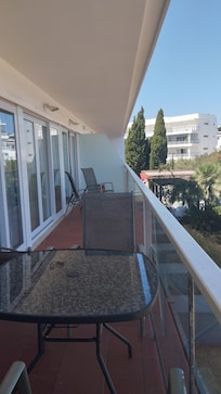 Estirando todo el ancho del apartamento con el salón, la cocina y las dos habitaciones con acceso directo. Con comedor y mesa de café, capacidad para 6 personas.