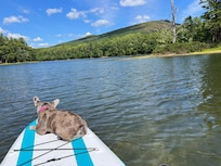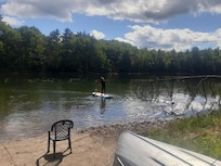 As you sit back and relax you will be amazed at all the eclectic decor that I have collected and used to decorate the cabin. The kids will enjoy counting the fish and ducks that rest upon the walls and beams and fall asleep in the birch tree beds I made in the loft. The views from the deck are wonderful, watch as a loon or heron spends time fishing in the pond, listen to the frogs and owls sing in the night, hear yourself echo off the pond and mountain, and gaze at the most wonderful star filled sky at night. The pond provides a peaceful time to float around on a tube or row around the pond and enjoy the wildlife or fish. No jet skis or motor boats allowed, mostly kayaks, canoes and we supply 2 Row boats for you to use. For those of you who want to bring your dog, the dirt road is great to take walks and the pond will keep them busy, the huge gated deck provides a place to confine them if needed. Come get away and relax and enjoy our peace of heaven!!