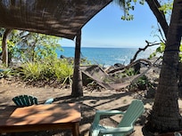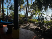 El cuarto de abajo está muy bien ubicado en la planta baja para aquellos que prefieren evitar las escaleras. Las ventanas son examinados para permitir que todas las brisas del océano fluyan a través. Despierta y Salga para el patio cubierto, donde podrá disfrutar de su café de la mañana con el fin pacífico del océano a pocos pasos de distancia! Toda la casa está configurado como una joya en una formación rocosa espectacular en el borde del océano. Iguanas tomar el sol en medio de las plantaciones tropicales y monos a menudo se pueden ver en los árboles.