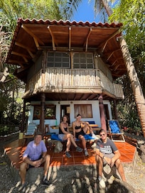 La habitación del segundo piso es enorme, más como un apartamento que un dormitorio. Con proyectado ventanas todo alrededor, usted se sentirá que está viviendo entre los árboles. Esta habitación tiene su propio mini-cocina, nevera, baño completo, y una caja fuerte para objetos de valor. Además de la cama de matrimonio, esta sala también tiene un sofá-cama (con dos colchones individuales reales) que pueden dormir dos más. En esta sala se despierta a magníficos amaneceres sobre el océano, tal vez con los monos aulladores en los árboles fuera.