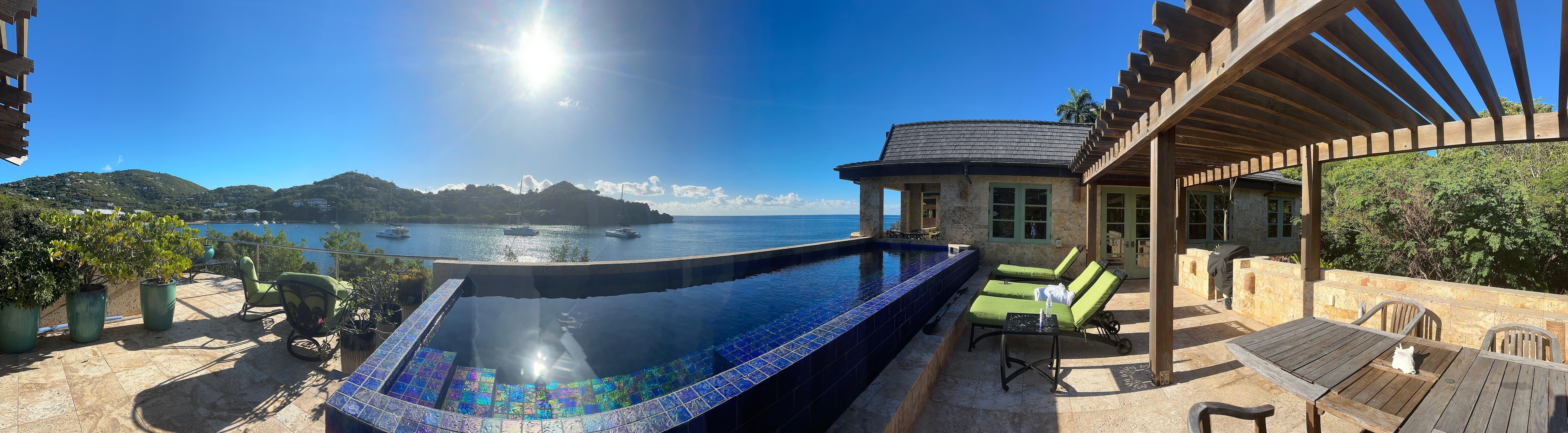 Vea cómo el sol brilla sobre el agua desde una amplia terraza con áreas de estar y comedor al aire libre y una piscina infinita, o haga una pausa para reflexionar junto al estanque koi o en el jardín de meditación. Después de que se ponga el sol, vea salir a las estrellas del jacuzzi en la terraza, acomódese en la televisión por satélite o comparta fotos del día a través de Wi-Fi.