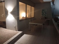 Amplia sala de estar con sala de estar, mesa redonda para las comidas, cocina, grandes ventanales con vista a la terraza.
