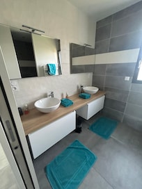 Un baño con 2 lavabos y muebles + ducha italiana.
