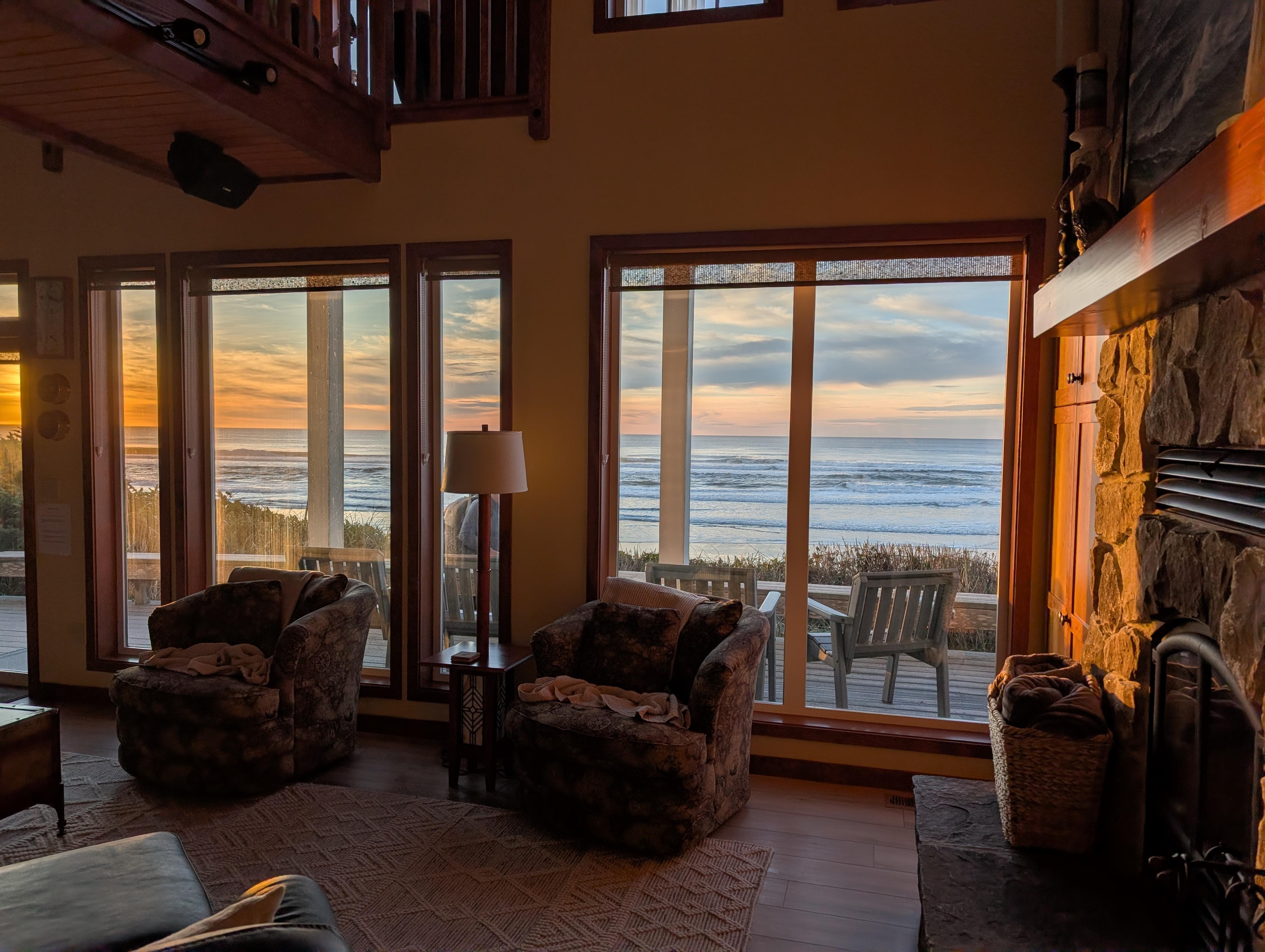 Warm, welcoming and perched on a bank right on the sand, this 3 master-bedroom, 4 person home, with its large dining area and an amazing second-story crow's nest, is ready for your next vacation. You can whale-watch, soak in the sunset from the private hot tub, take a walk on the beach, or read a book next to a cozy fire. This place has it all with 3 master bedrooms that are beachside with amazing views and ensuite bathrooms. The home has two seating areas -- a living room with a natural burning fireplace and new couches,as well asa crow's nest that is open to the living room below. The kitchen is spacious and fully appointed with a large dining area that opens to the living room. Not to mention, all of the floors in the home have recently been replaced!