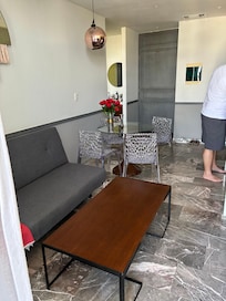 - A dining table for 4 to enjoy relaxing meals anytime or use as a little laptop workspace