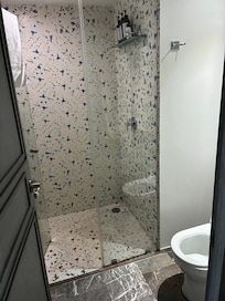 - A full modern bathroom with stand-in shower