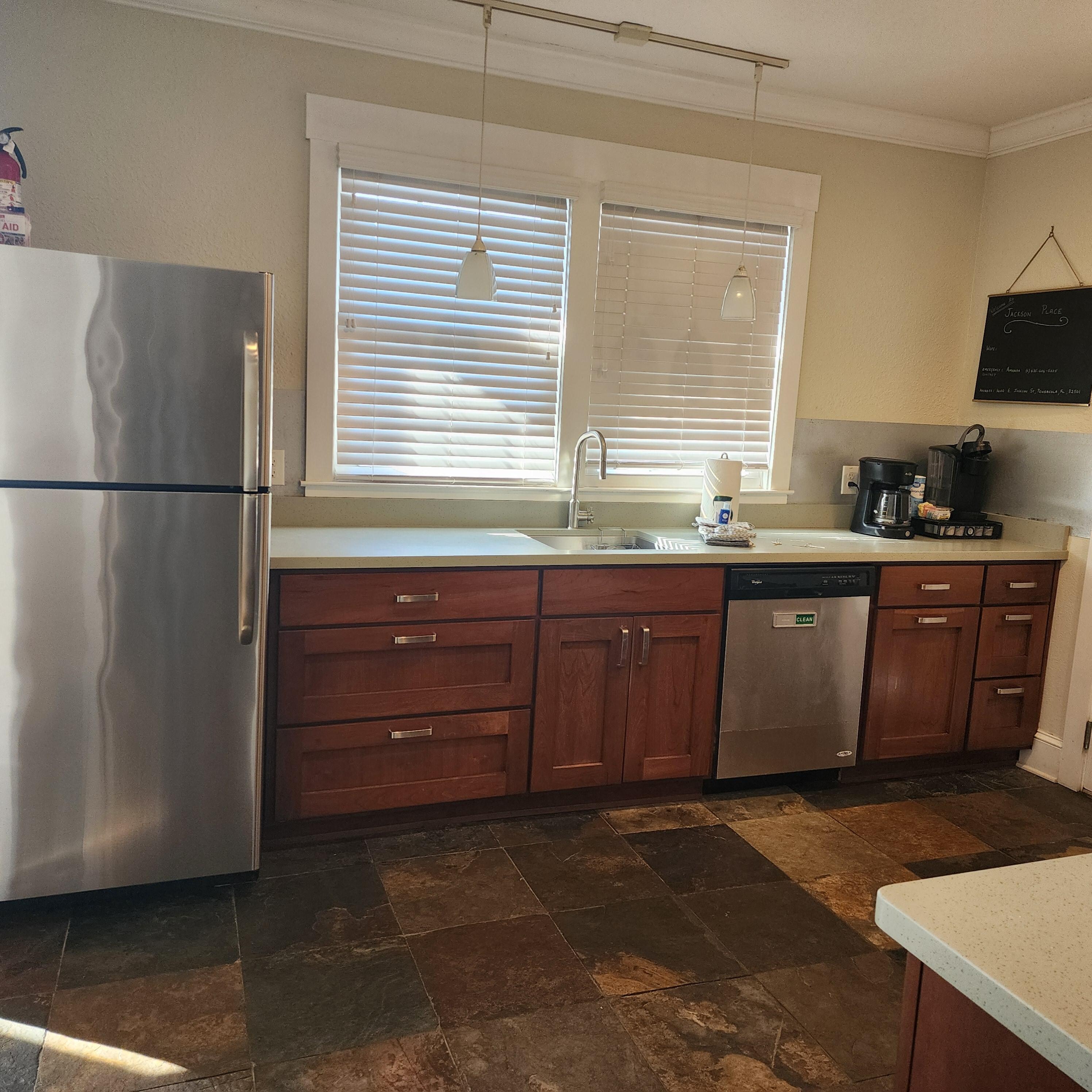 - Refrigerator, gas stove/oven, dishwasher