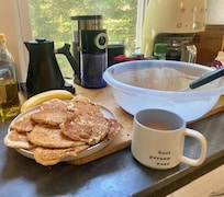 - Drip coffee maker (bring your own coffee), coffee grinder, tea & sugar