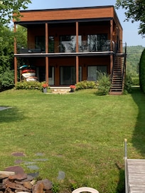 Enjoy breathtaking lake views from the terrace, relax by the water, or head out for an adventure with the included pedal boat and paddle board. In summer, dive into the lake from your private dock, and in winter, enjoy nearby snowshoe trails, ski resorts, and groomed snowmobile paths.