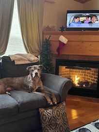 Step inside this relaxing retreat and find wooded views, an inviting living area complete with comfortable seating, a ceiling fan, a large flat-screen Roku TV, and a gas fireplace. The living room has ample lighting and porch access. Have some friendly competition in a fun game of checkers, a round of pool, or a friendly competition of Foosball. This cabin offers plenty of games to choose from, including a convertible game table. Wifi can be found throughout the cabin. The sleeper sofa pulls out to make a Queen-size bed. (Linens provided)